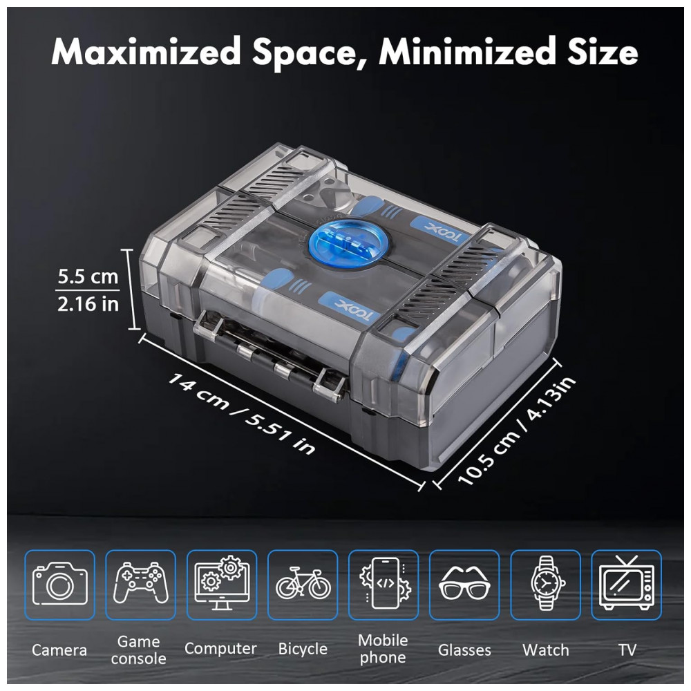 • Conteúdo da caixa: 41 bits padrão, 20 bits precisão, 9 soquetes 1/4″, 1 cabo ratchet reversível, 1 cabo screwdriver, barras extensão, adaptadores socket/bit, suporte magnético bits, pinça, caixa organizadora