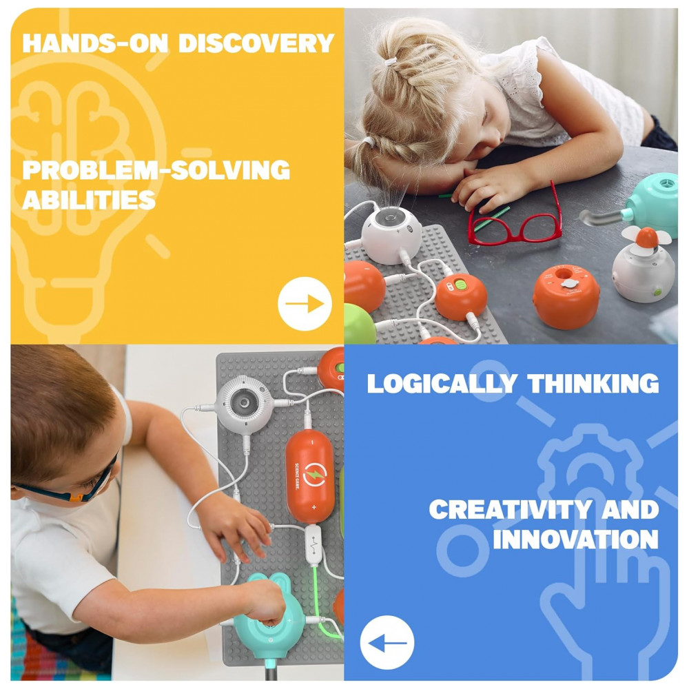 O conjunto acompanha um manual colorido de cerca de 37 páginas e cartões de indicação que explicam, em mais de 100 esquemas primários, como montar diferentes projetos de luz, som, movimento e efeitos especiais, a partir dos quais a criança pode criar variações. O sistema utiliza alimentação por pilhas AA (não incluídas), trabalha em baixa tensão e foi projetado para uso em casa ou sala de aula como apoio a conteúdos de ciências, raciocínio lógico e criatividade.