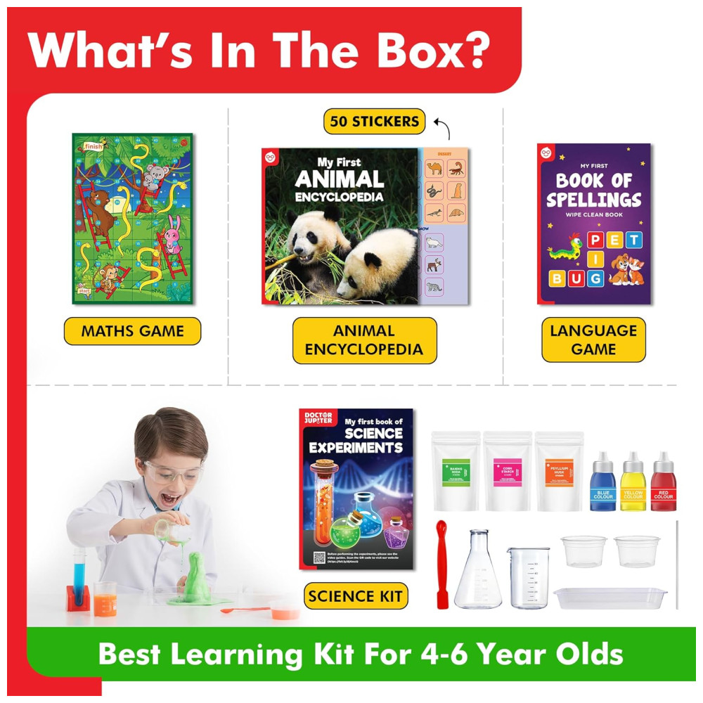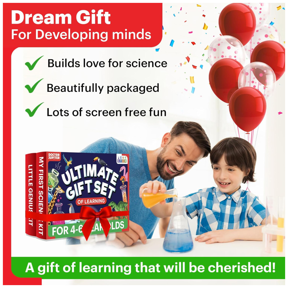 Este conjunto de presentes de aprendizagem Doctor Jupiter Ultimate é ideal para crianças de 4 a 6 anos. Composto por uma coleção distinta de kits educacionais e de aprendizagem, é perfeito para celebrar ocasiões especiais como Natal, aniversários e conquistas. O kit científico Doctor Jupiter My First Science Kit oferece 50 experimentos divertidos e seguros para ajudar as crianças a desenvolver um amor precoce pela ciência, sem precisar de telas. Além disso, o conjunto inclui 5 brinquedos educativos de aprendizagem precoce especialmente selecionados para crianças de 4 anos ou mais, que ajudam a fortalecer habilidades motoras e ampliar o horizonte de pensamento. Projetado especificamente na abordagem STEM, este conjunto de presentes ajuda as crianças a adquirir conjuntos de habilidades para a vida toda. Todos os kits de aprendizagem incluídos atendem aos mais altos padrões em brinquedos, seguindo as normas de segurança da ASTM F96317 dos EUA. Com equipamentos premium, ferramentas inovadoras e manuais de instruções abrangentes, este conjunto certamente proporcionará uma experiência perfeita para você e seu filho. E se ainda assim você não estiver satisfeito, oferecemos um reembolso de 100 sem fazer perguntas
