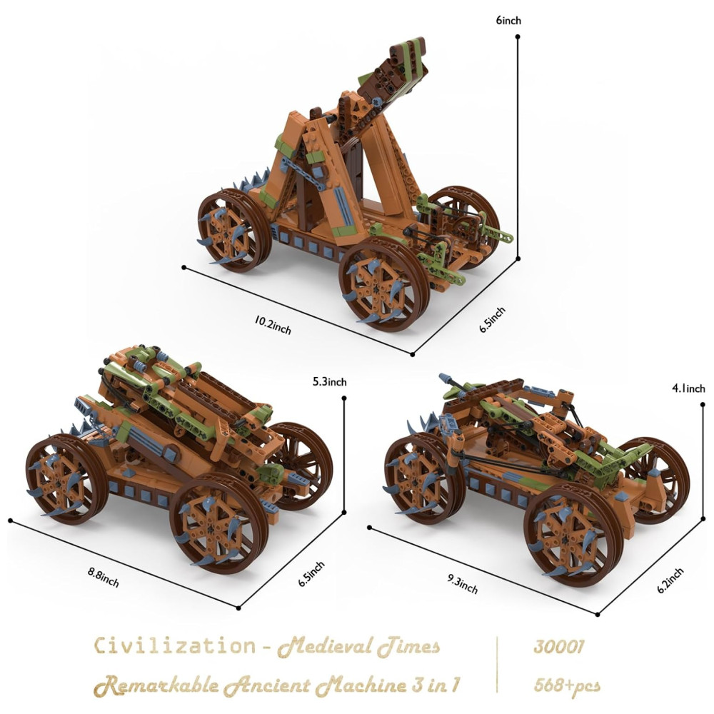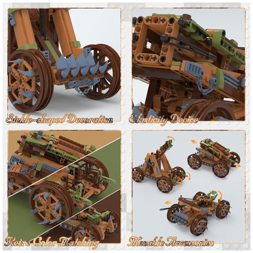 3 modos de ataque exclusivos: A cor retrô do conjunto de blocos de construção 3 em 1 fará você se sentir como se estivesse viajando no período medieval. O contorno e a frente de cada roda têm uma decoração única em forma de foice em azul claro, que não só desempenha um papel defensivo, mas também embeleza a aparência. Todos os três modelos têm seus próprios modos de ataque exclusivos que simulam campos de batalha antigos durante o jogo, trazendo mais diversão às atividades dos blocos de construção.