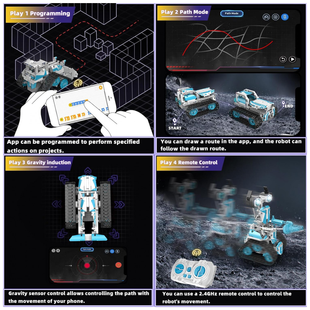 Controle remoto: o robô possui um alto grau de simulação e um design futurista no estilo de veículo, combinando os recursos de blocos de construção e carros de controle remoto para uma experiência de jogo mais envolvente. Os quatro motores no chassi grande permitem a funcionalidade completa do controle remoto, incluindo o jogo de interação de vários carros de 2,4 GHz, um controle remoto de até 30 metros e movimento em todas as direções.