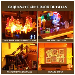 Detalhes requintados: O design detalhado do produto é cheio de diversão e realismo, restaurando totalmente a verdadeira arquitetura ocidental, incluindo fachadas falsas, portas de morcego, barris de vinho, balcões de bar, pedidos de recompensa, etc., proporcionando uma experiência envolvente.