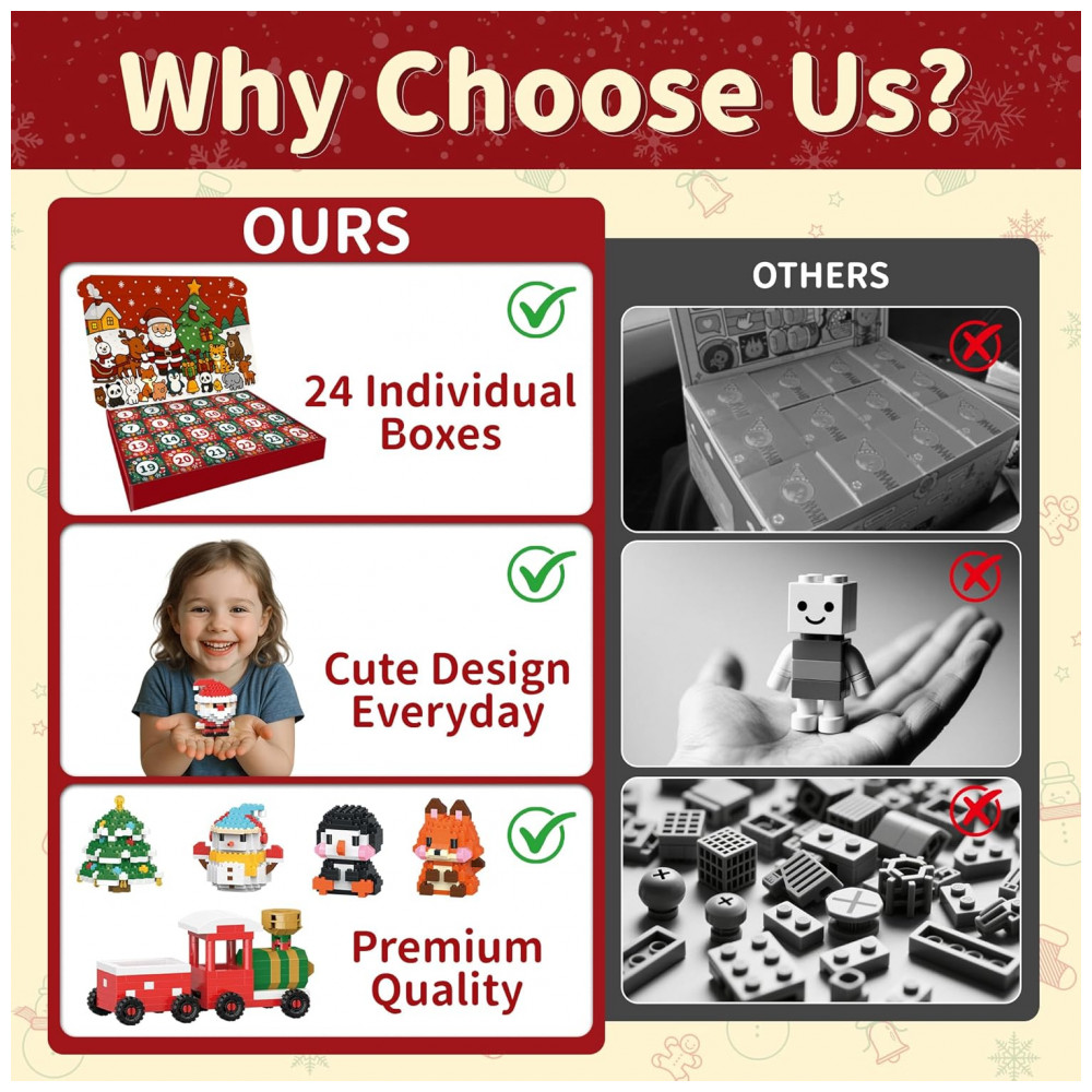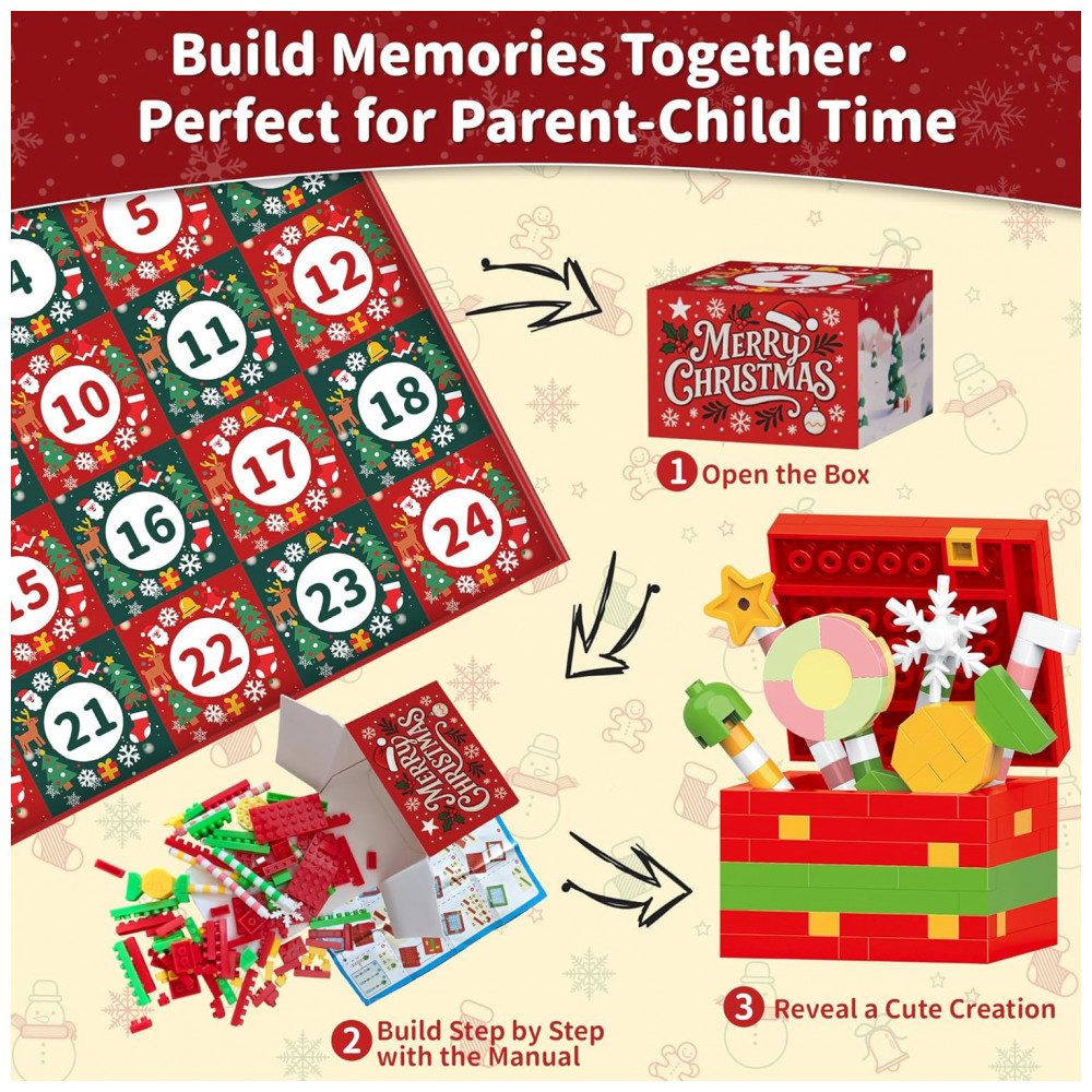 Desembrulhe um novo e adorável animal ou figura natalina para montar a partir de 1 a 24 de dezembro com nosso calendário do advento de Natal 2025 para crianças, criando empolgação festiva e expectativa para as festas. Montagem Passo a Passo: Cada bloco de construção do nosso conjunto Calendário do Advento 2025 para meninos e meninas vem embalado individualmente com um guia fácil de seguir, perfeito para montar de forma independente. Materiais Premium: Feito de ABS durável com superfícies lisas e sem rebarbas, garantindo uma brincadeira segura e diversão duradoura para as crianças. Educacional e Divertido: A atividade de brinquedo do calendário do advento de 24 dias melhora o reconhecimento de cores e formas, a concentração, a paciência e as habilidades de resolução de problemas. Presente de Natal Perfeito: Inclui calendário do advento de animais de 12 dias e calendários do advento de Natal de 12 dias. Ideal para presente de Natal para crianças, adolescentes e meninos e meninas, combinando diversão, criatividade e alegria festiva.