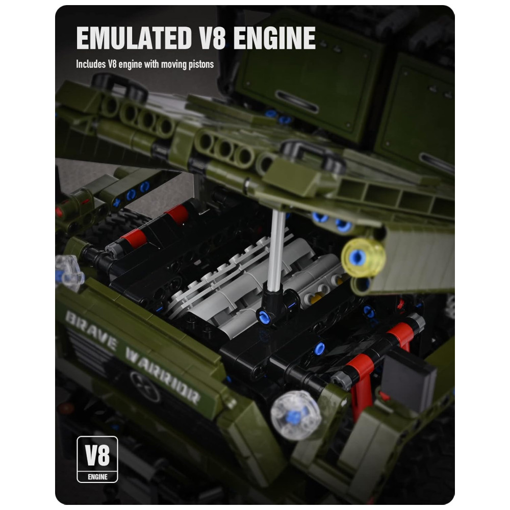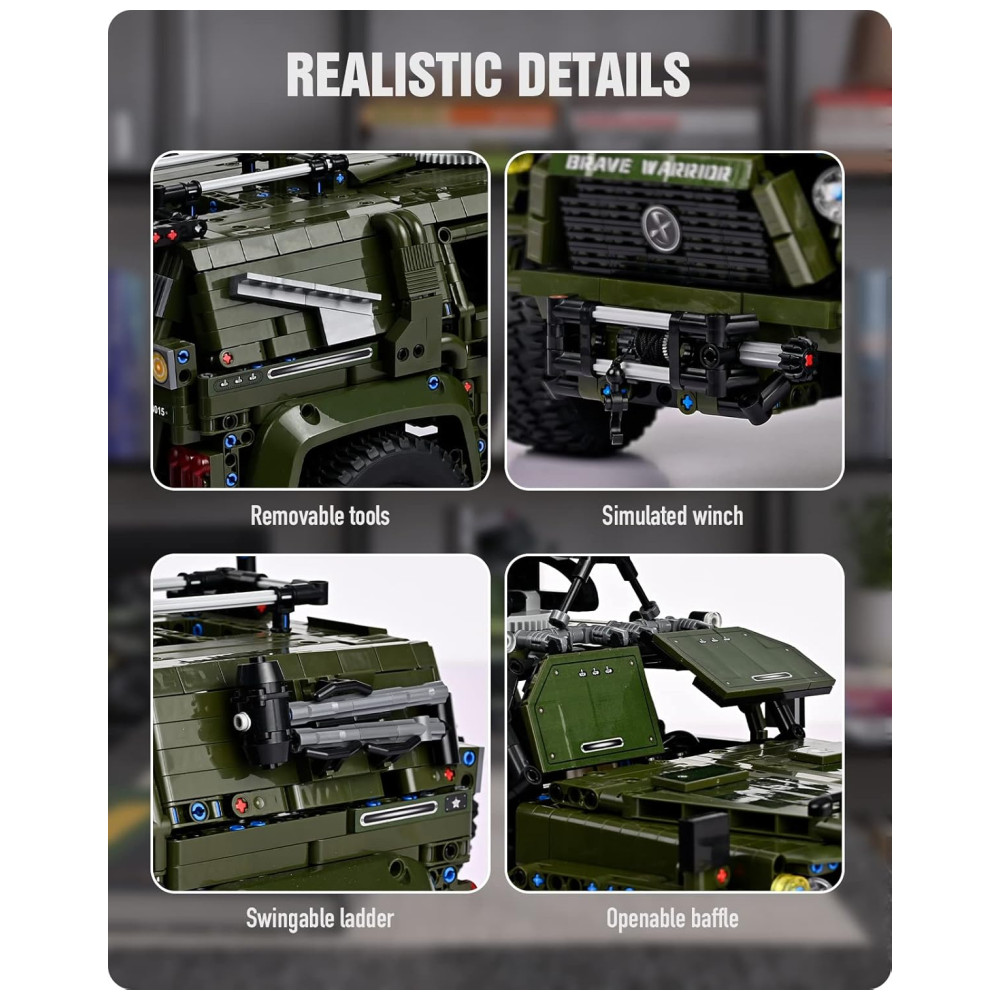 Construído com 3.175 peças, este modelo altamente detalhado vem com recursos militares autênticos, como guincho, pá e muito mais. Replica o verdadeiro veículo Warrior com abertura do capô do motor, portas, dura à prova de balas e outros designs realistas. Apresenta motor V8 funcional, volante, suporte de mira e outros detalhes funcionais, assim como o caminhão militar real. Presente ideal para fãs militares apresentado em caixa luxuosa com manual de instruções e sacos de peças numeradas para fácil construção. O modelo grande em escala 1:8 mede 49,02 centímetros C x 22,99 centímetros L x 23,5 centímetros A para uma experiência de construção envolvente