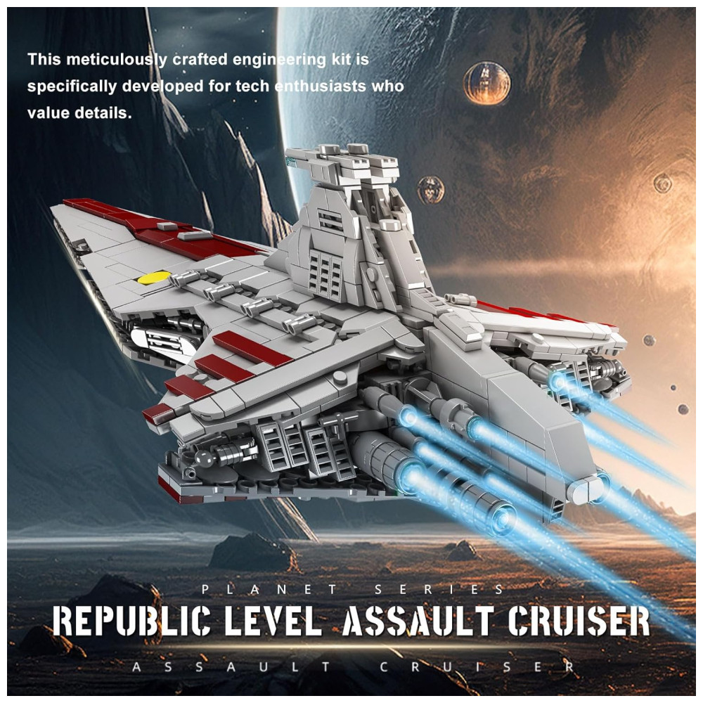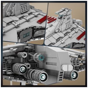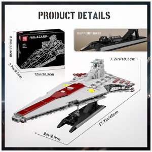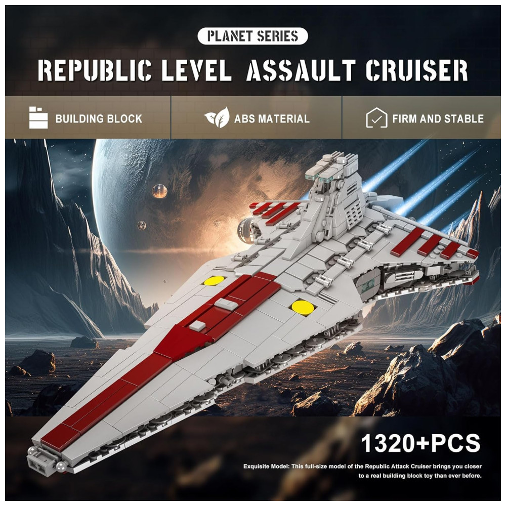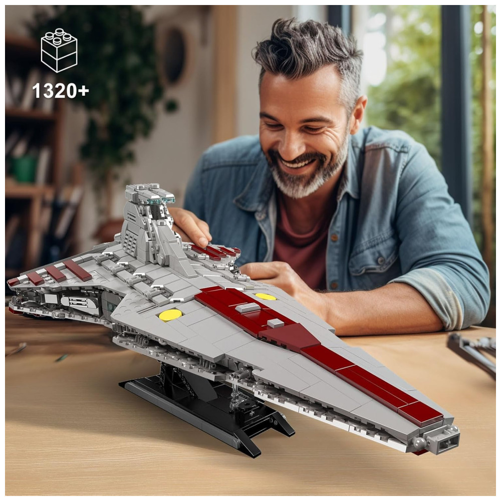 Este modelo de cruzador de ataque da República da classe Venator é uma réplica impressionante, com 45 centímetros de comprimento, 23 centímetros de largura e 18,5 centímetros de altura. O kit contém 1320 peças feitas com materiais duráveis e resistentes, incluindo tijolos de plástico ABS de alta qualidade que são resistentes ao desgaste.