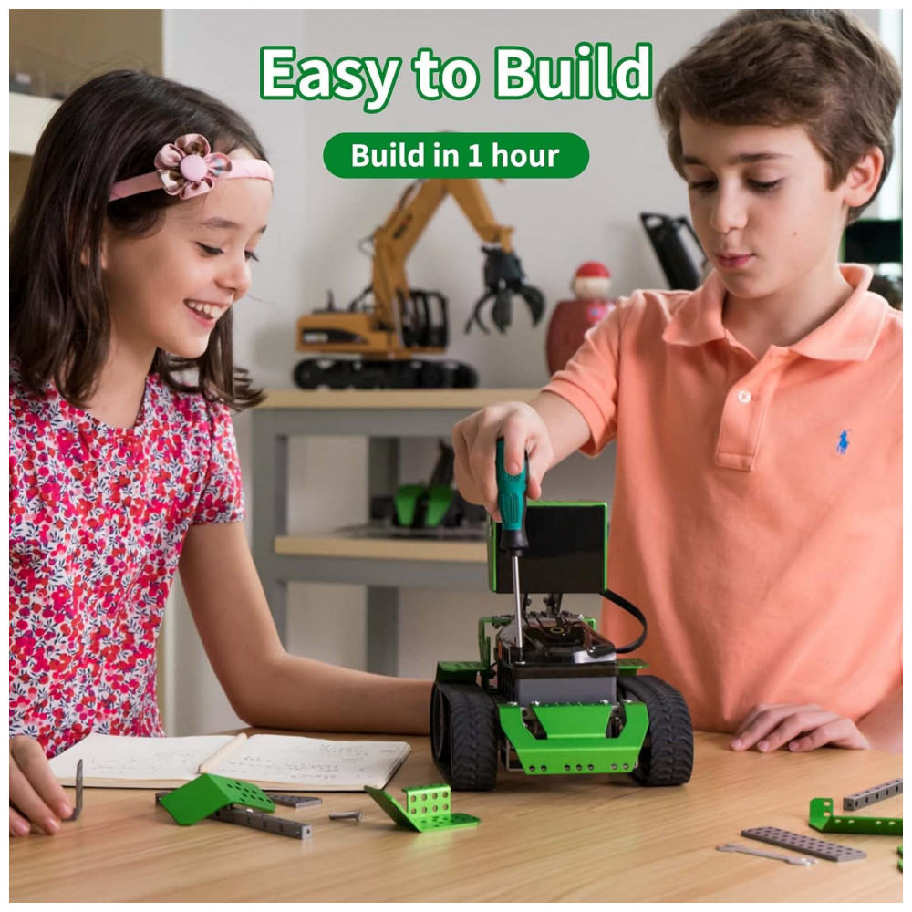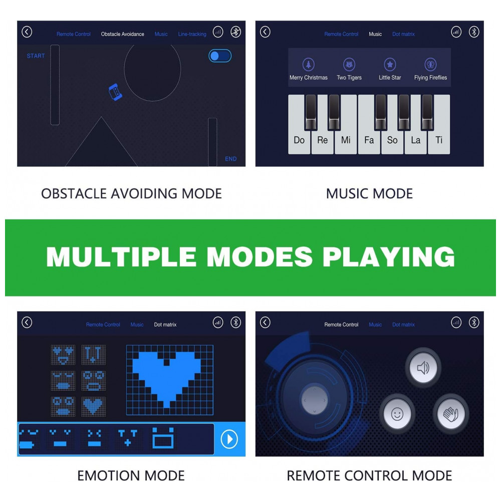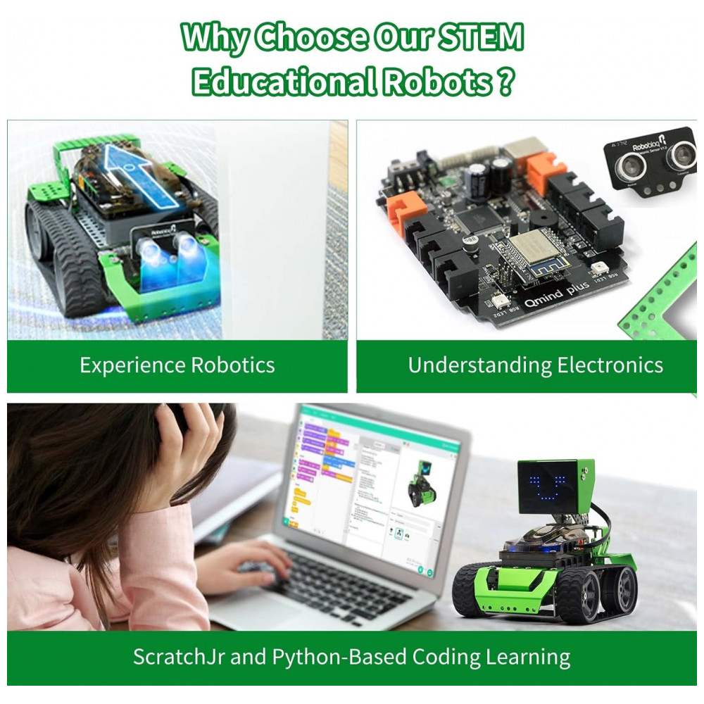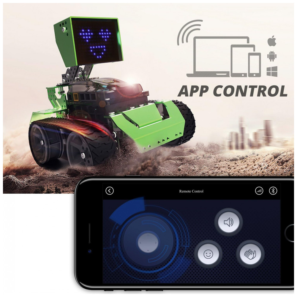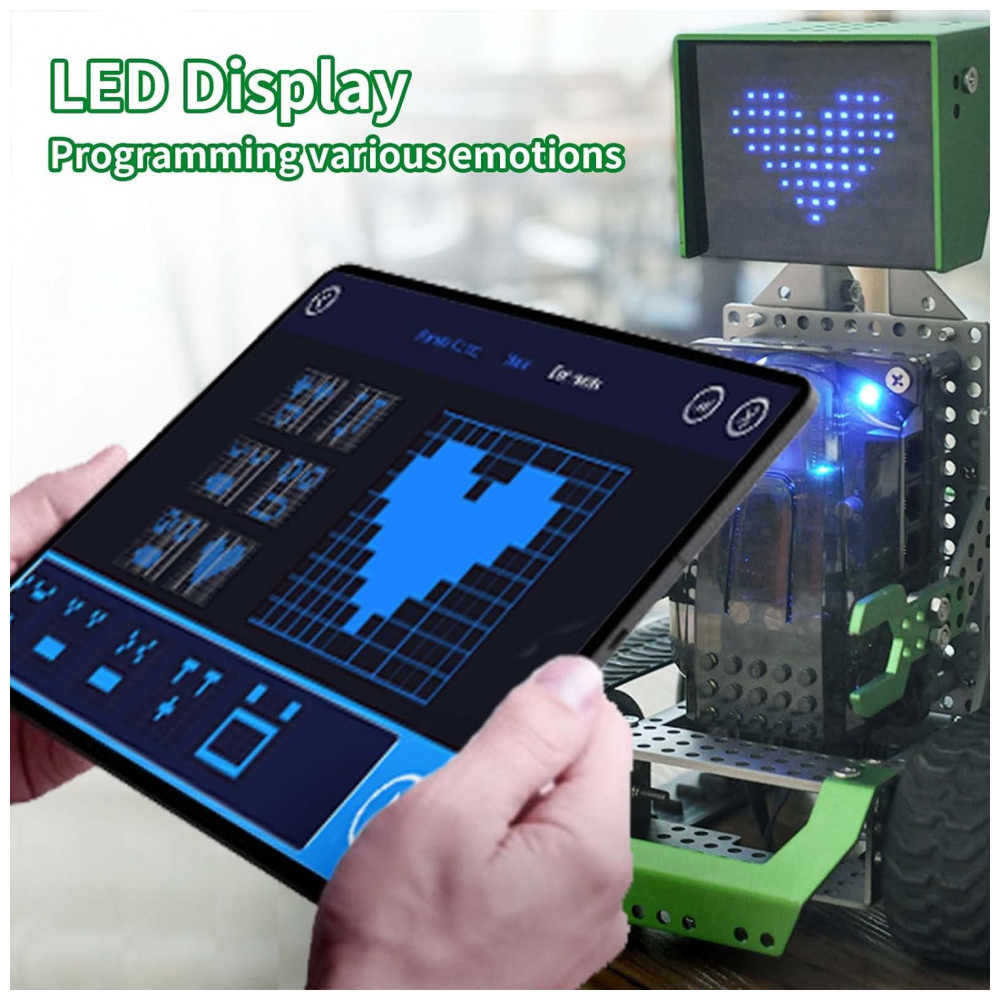Acessórios abundantes e alta qualidade Diferenças de minorias de produtos de codificação de tradições práticas, ou robô Robobloq é um material de liga de alta qualidade, ABS espesso e estima de borracha, que é poderoso e duradouro. Listas de produtos 233 peças de montagem, incluindo 1 sensor ultrassônico, 1 matriz de LED, 1 campanha, 1 placa de controle, 2 LEDs RGB e 2 motores. Fonte de alimentação 6 pilhas AA não inclinadas