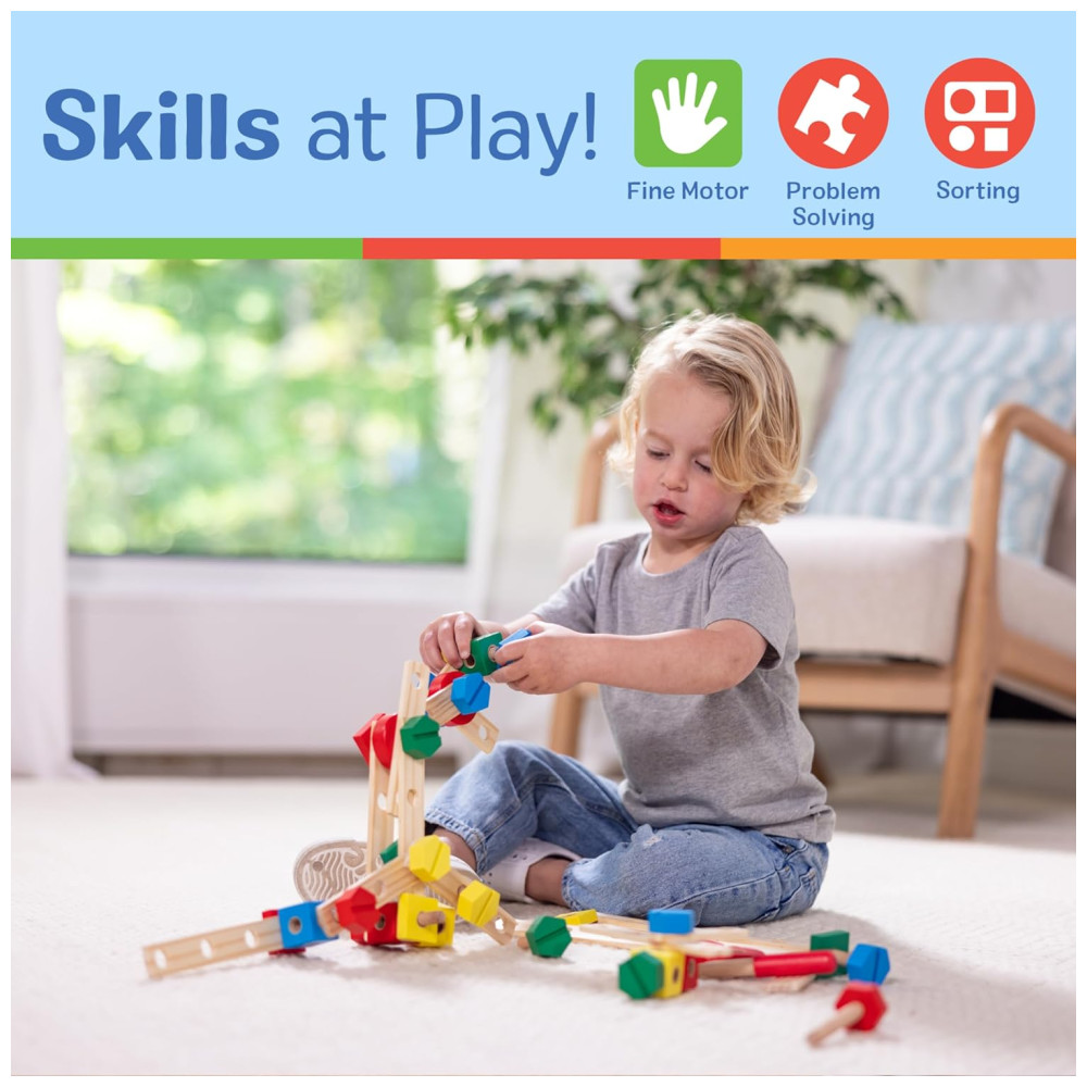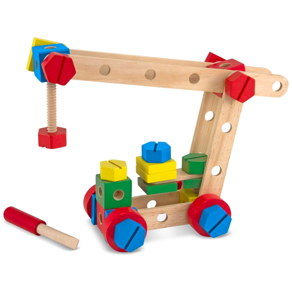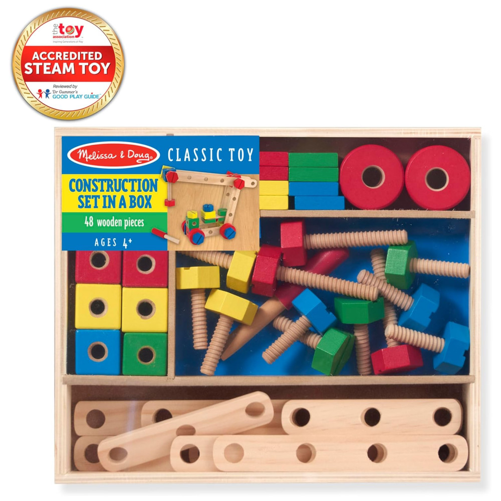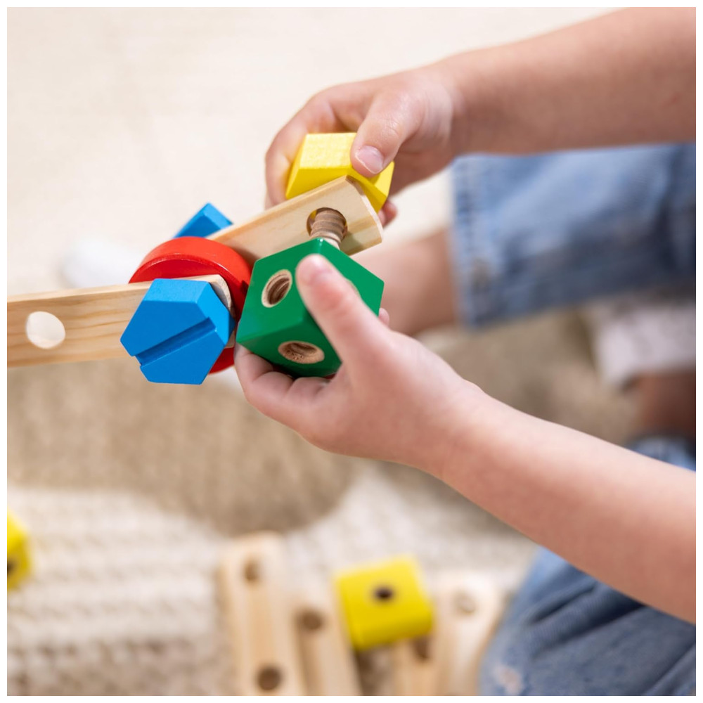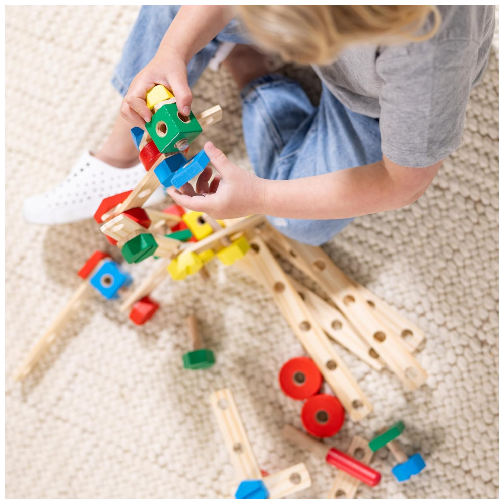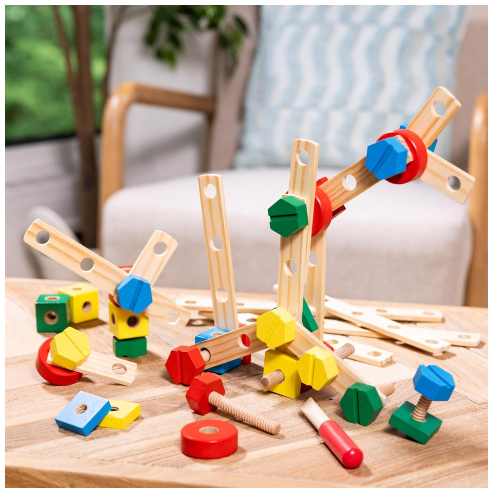 Este conjunto de construção de madeira Melissa Doug em uma caixa vem com 48 peças de madeira, incluindo porcas, parafusos, barras perfuradas para conectar e uma chave de fenda infantil para ajudar os construtores iniciantes a realizar o trabalho.