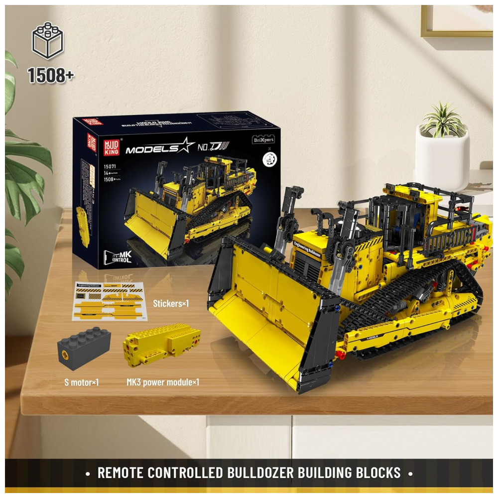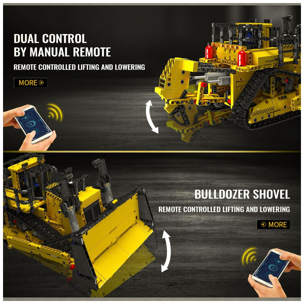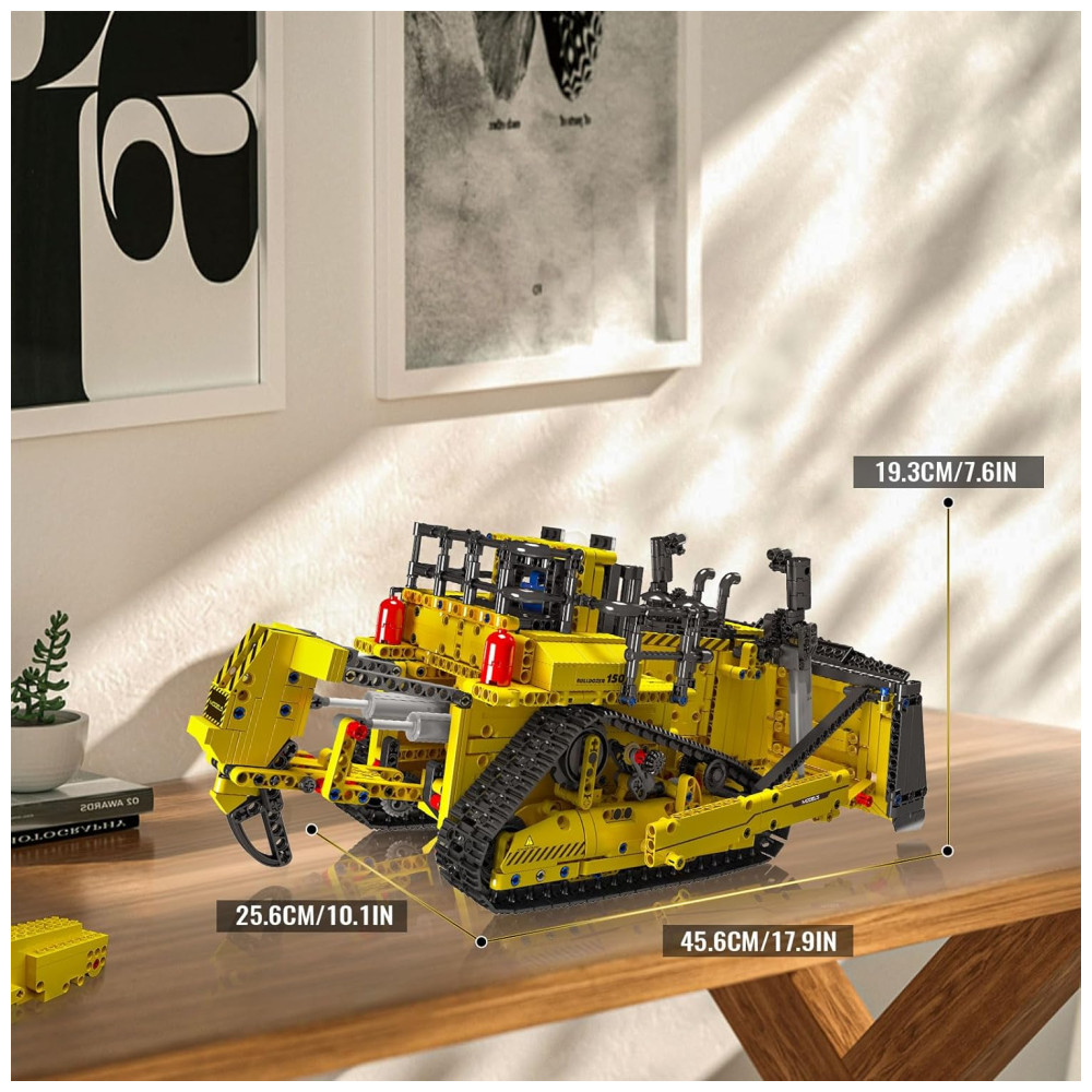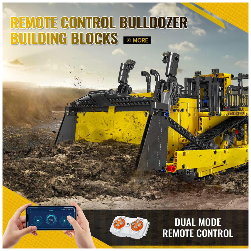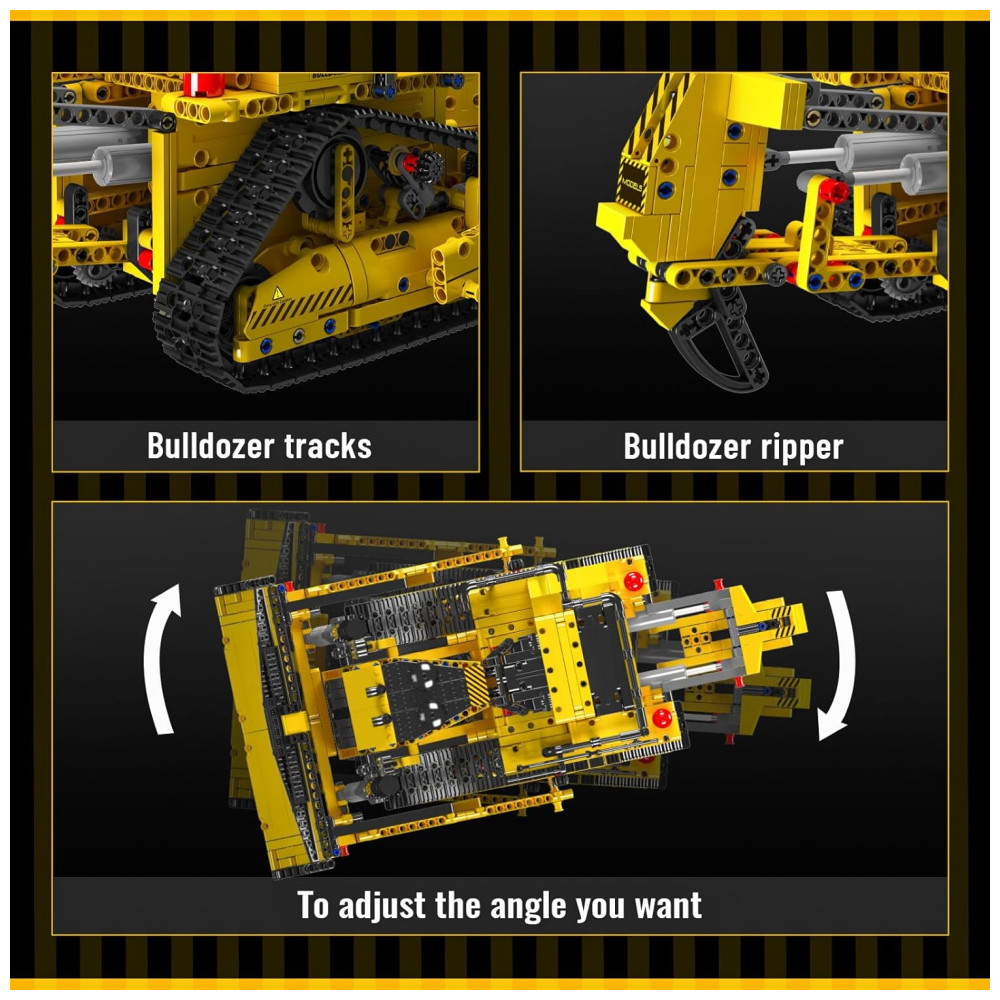 Este bloco de construção é uma réplica fiel de uma escavadeira de esteira, com diversas funções realistas, como acionamento de esteira, elevação de lança e direção flexível, elevação e abaixamento de caçambas, escarificadores e escadas. O modelo é feito de plástico ABS de alta qualidade, com linhas de modelagem suaves e proporções coordenadas, lembrando muito a aparência do veículo original.