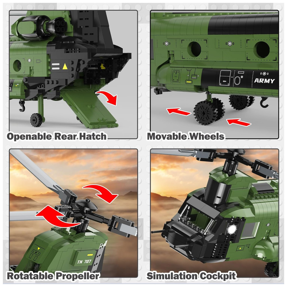 Kit de helicóptero clássicoUse sua imaginação e criatividade para construir um modelo de aeronave militar legal a partir do conjunto de blocos de construção de helicóptero, e você terá uma sensação de realização. E o design do brinquedo helicóptero é clássico e distinto, este conjunto adulto é perfeito para meninos, adolescentes ou adultos que amam brinquedos militares.