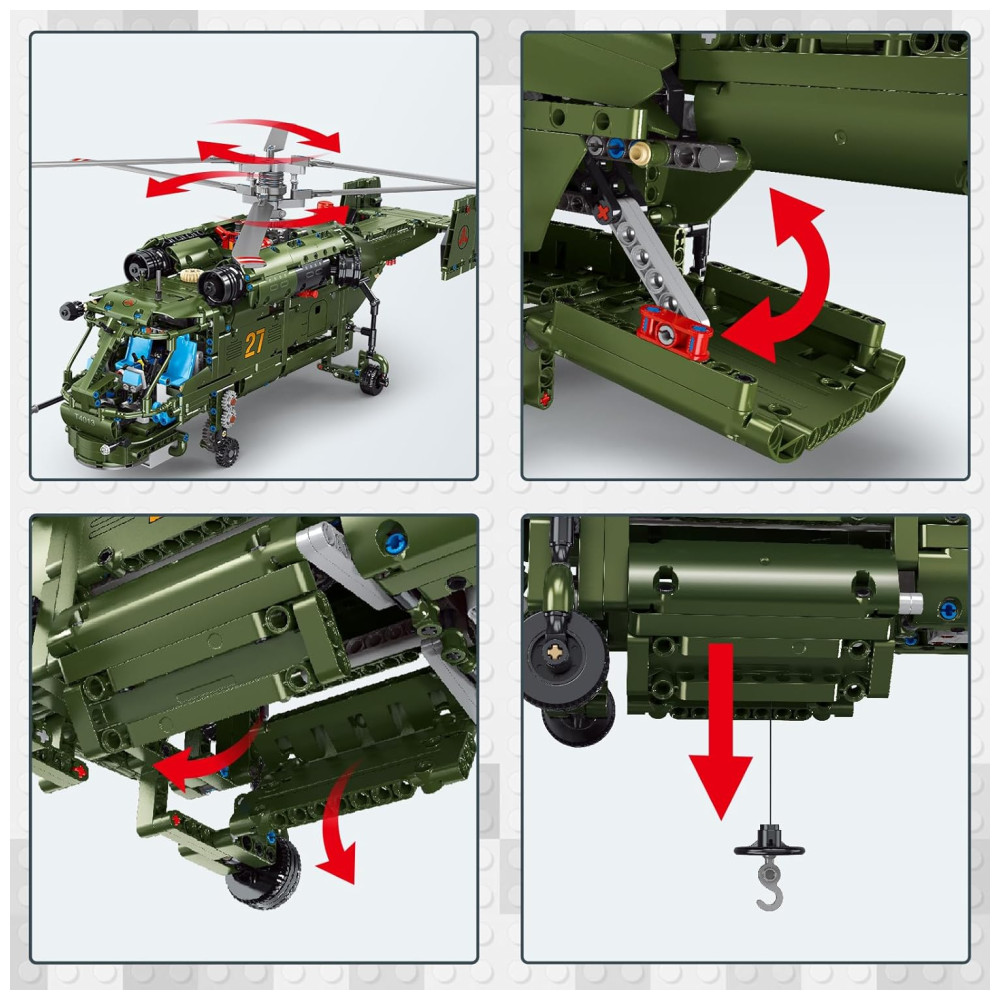 Design flexível múltiplo Desbloqueie um mundo de surpresas ao explorar os recursos ajustáveis do helicóptero desde a barbatana caudal até as pás giratórias do rotor. Manobrando as rodas dianteiras, abra a porta de carga traseira e o compartimento inferior para revelar detalhes intrincados esperando para serem descobertos.