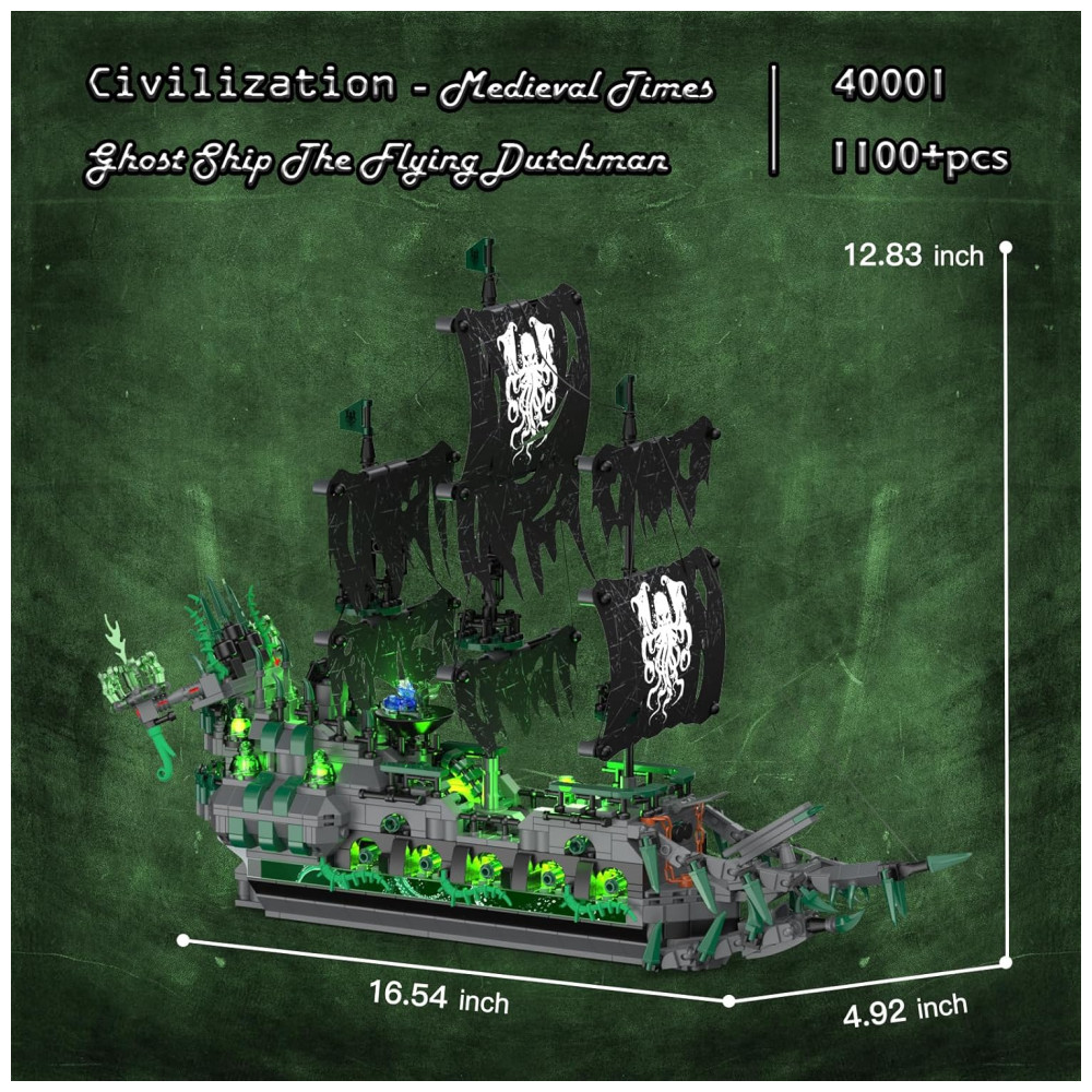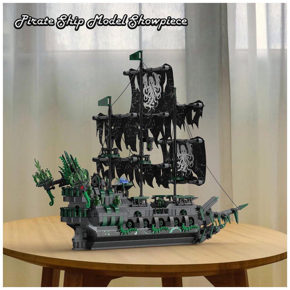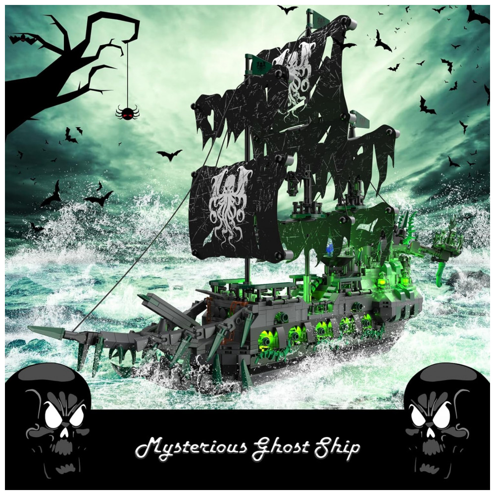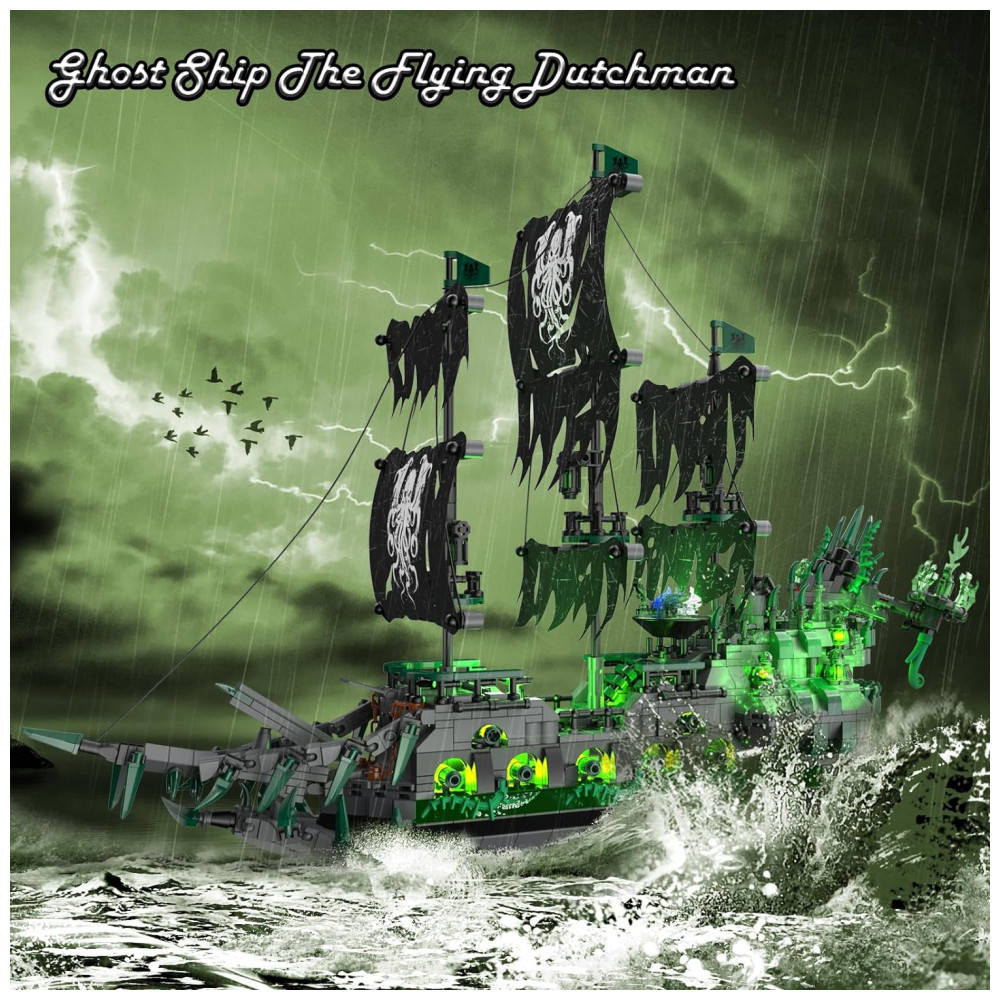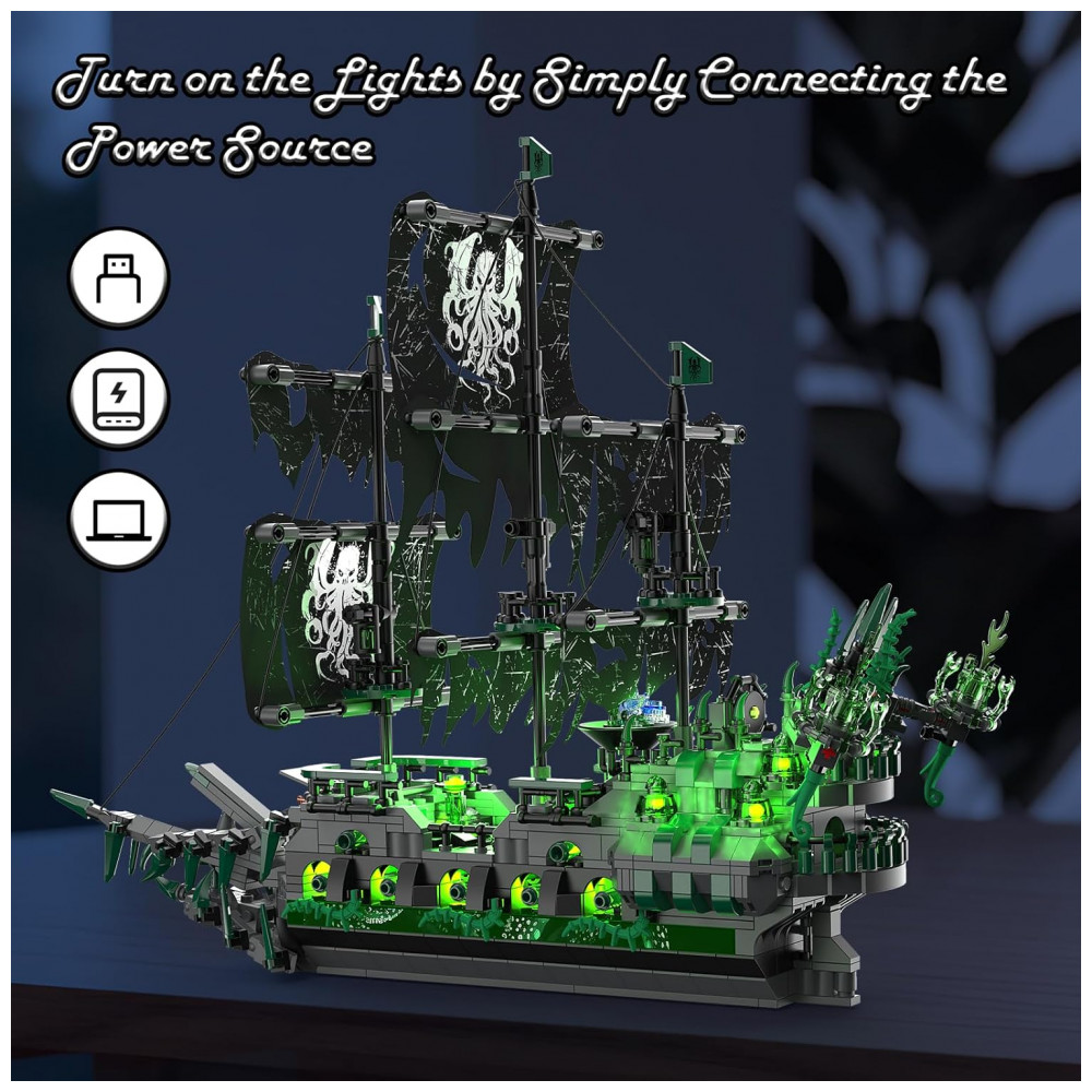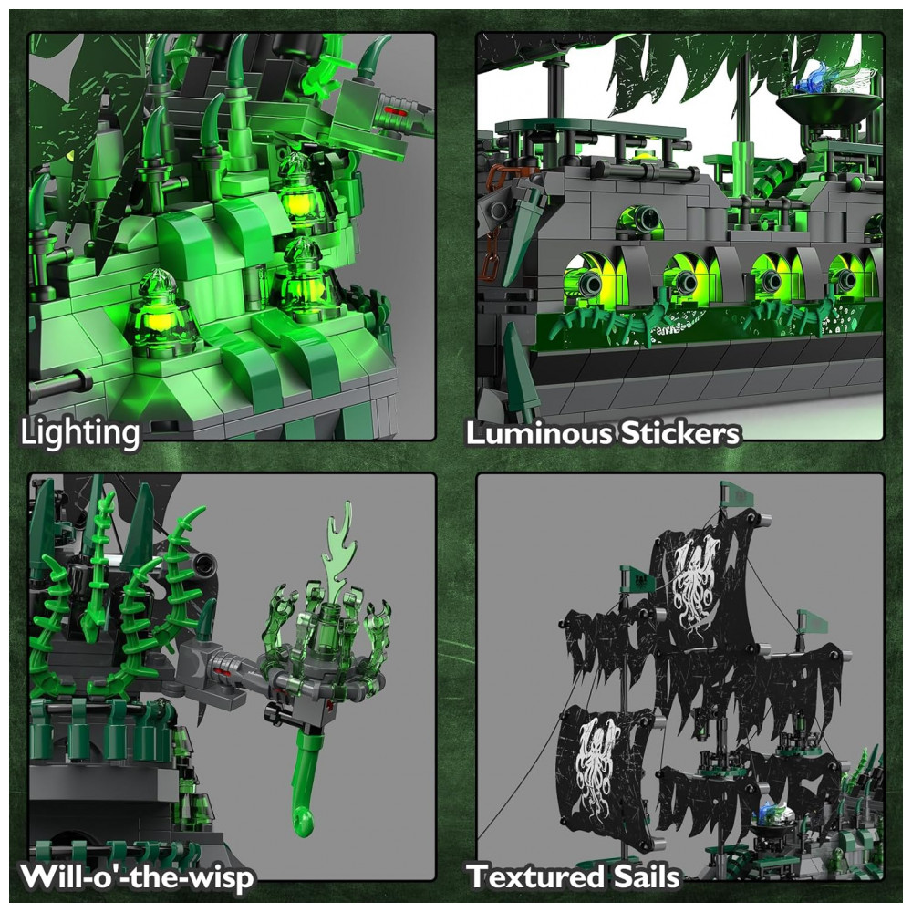 Kit de Construção Navio Fantasma Flying Dutchman com Luzes e 1100 Peças JMBricklayer Preto e Verde