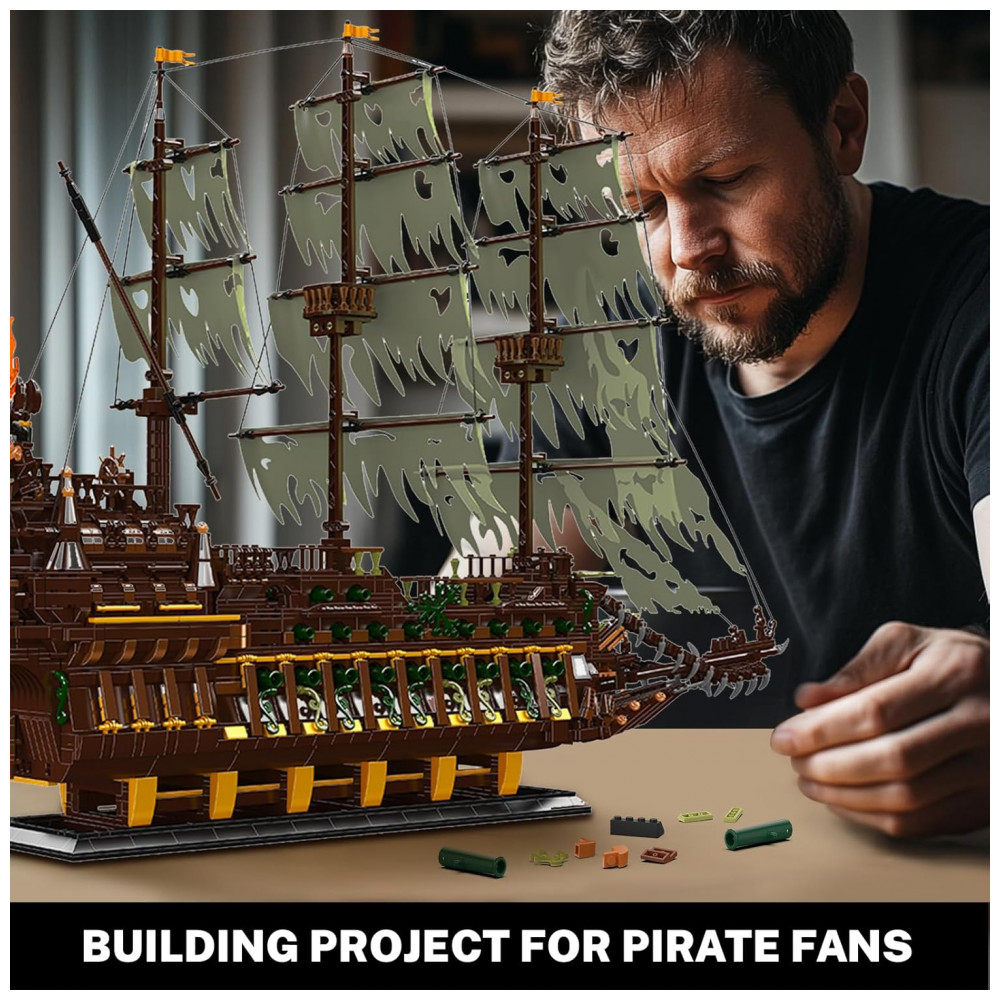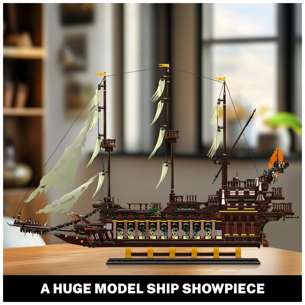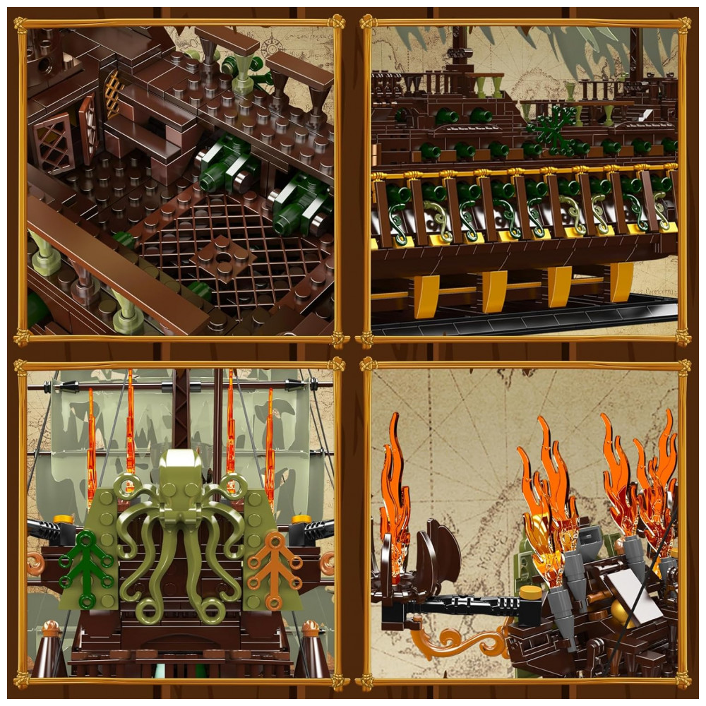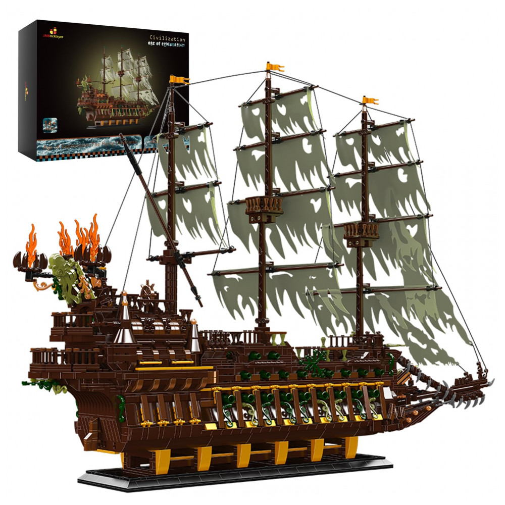 Modelo de navio legal: O navio preto JMBricklayer composto por 3653 unidades. O modelo do navio é muito realista, incluindo canhões nas laterais do casco, 3 mastros e a torre de vigia. Com a missão de escoltar os mortos no mar até o submundo, este é um navio fantasma que nunca poderá voltar para casa.