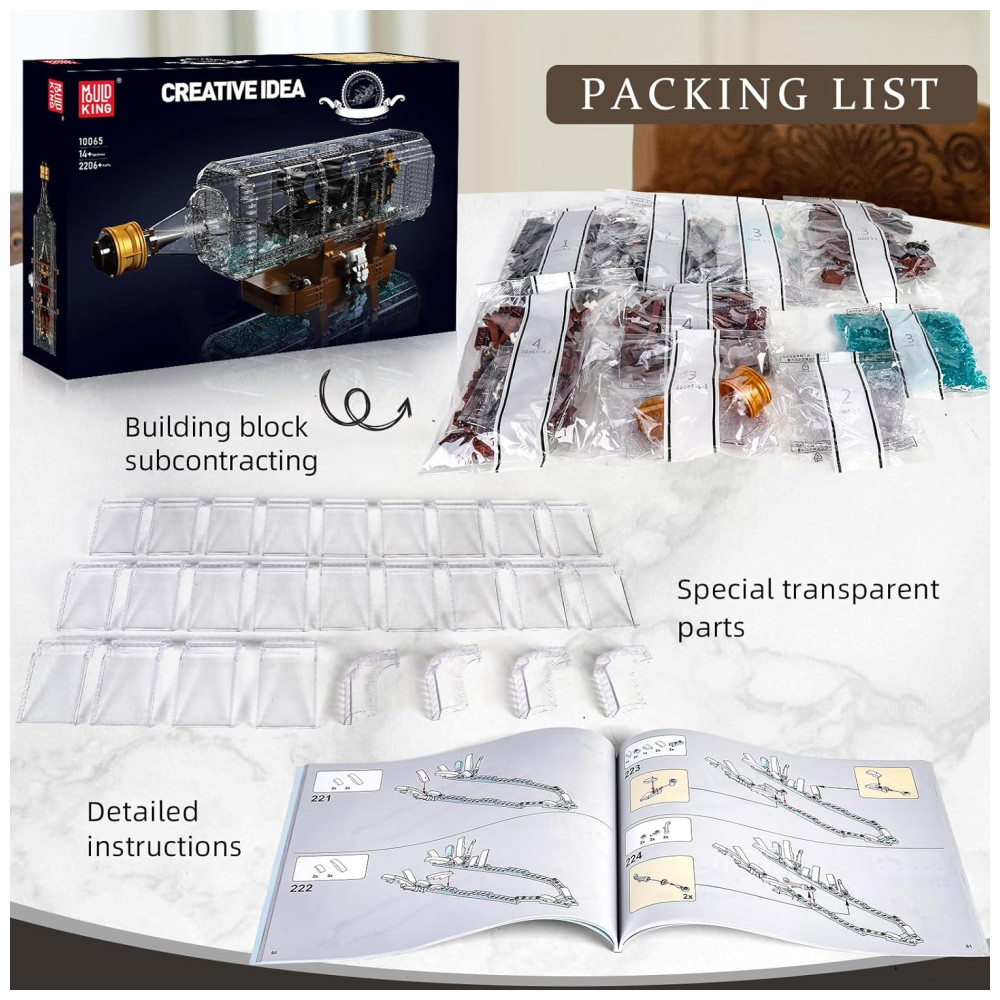 Este é o kit de construção Molde King 10065, embalado em caixa independente com manual detalhado de fácil compreensão para técnicos. Composto por 2206 peças, este conjunto é ideal para entusiastas da construção e vem embalado individualmente. O navio pirata Pérola Negra é o destaque do kit, com 54,4 cm de comprimento, 18,8 cm de largura e 19,5 cm de altura.