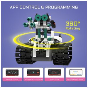 Controlo remoto e controlo APP: Os robôs inteligentes podem ser controlados através de ligação Bluetooth em aplicações móveis. Modo de controlo remoto, modo de percurso, sensor de gravidade e modo de programação, e quatro modos de controle remoto são simples e fáceis de usar. Além disso, ele também pode ser controlado através do controle remoto 2.4GHz incluído na embalagem. A distância de controle remoto do robô de construção excede 20 metros. Faça a sua experiência mais flexível e fácil de controlar.