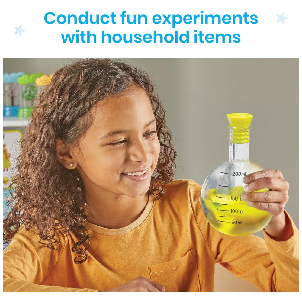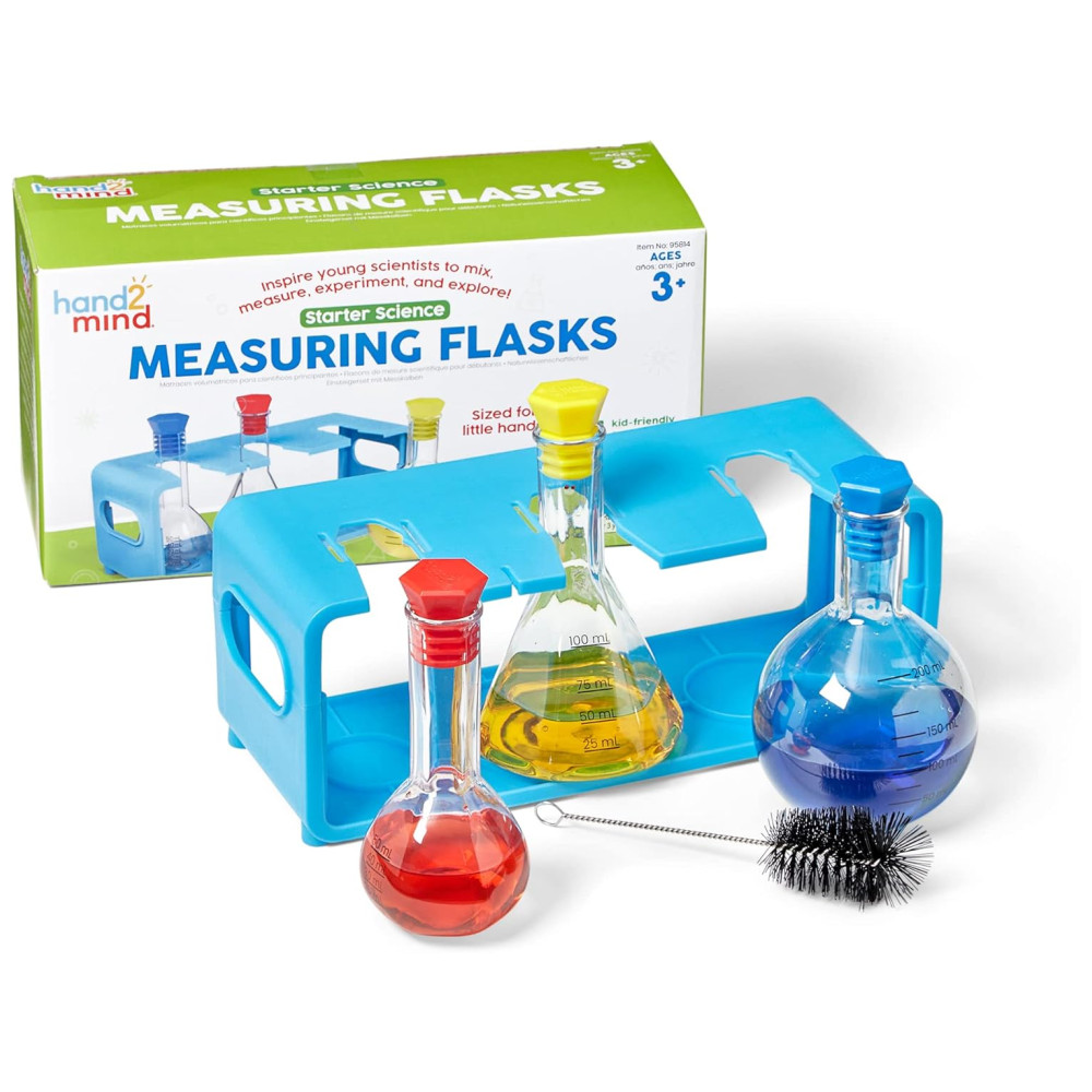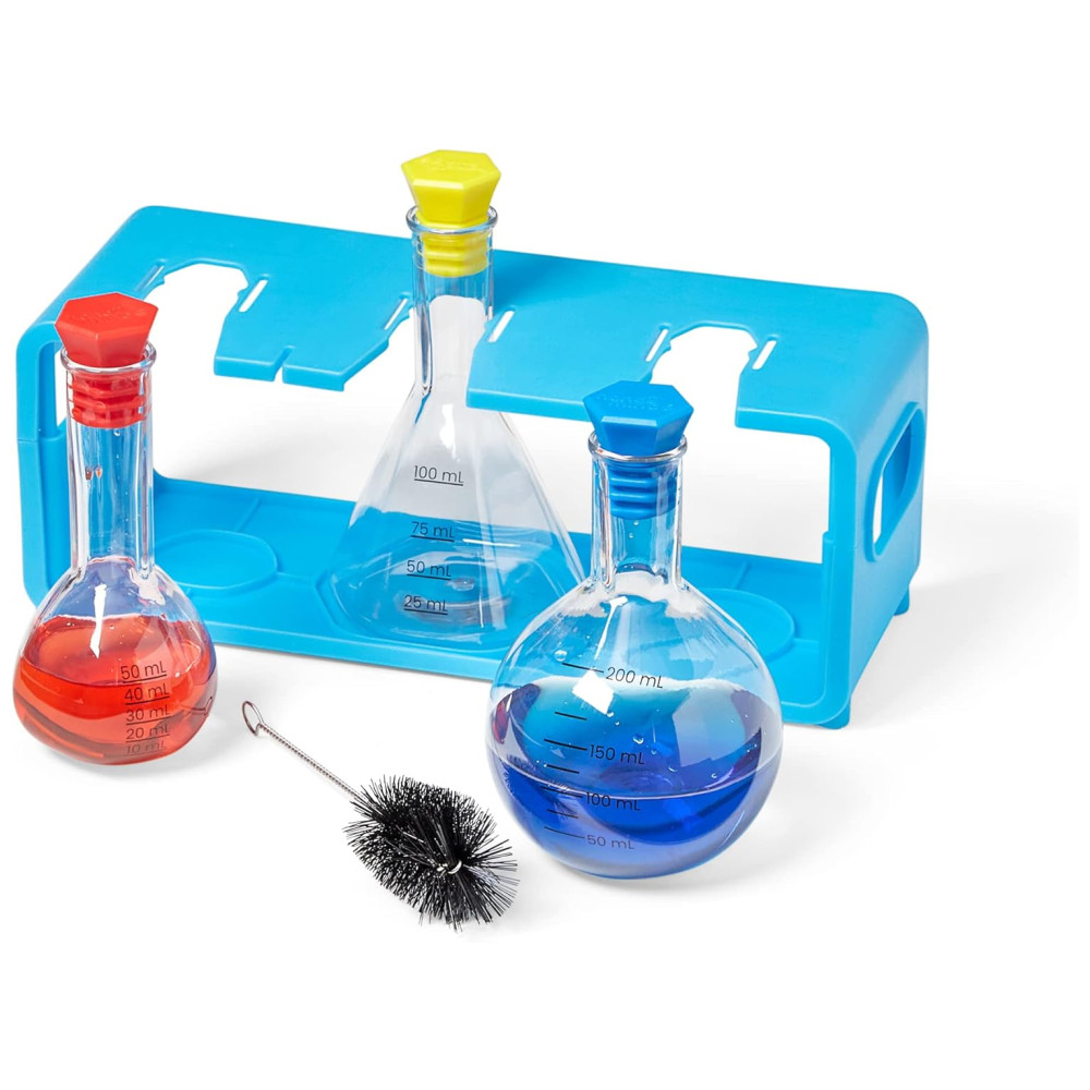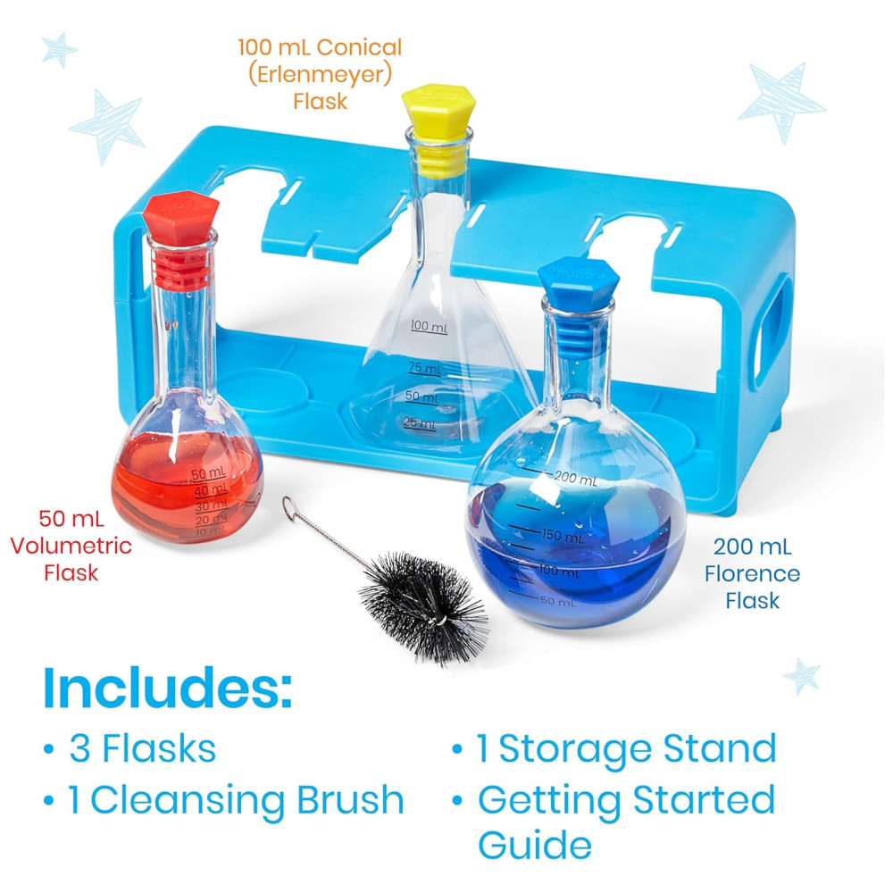 O conjunto inclui 3 frascos balão volumétrico de 50 mL, frasco Erlenmeyer de 100 mL, frasco Florence de 250 mL, uma escova de limpeza, um suporte para armazenamento e um guia de primeiros passos. A hand2mind, empresa especializada em kits científicos e brinquedos STEM, promove a aprendizagem prática e ajuda as crianças a desbloquear todo o seu potencial.