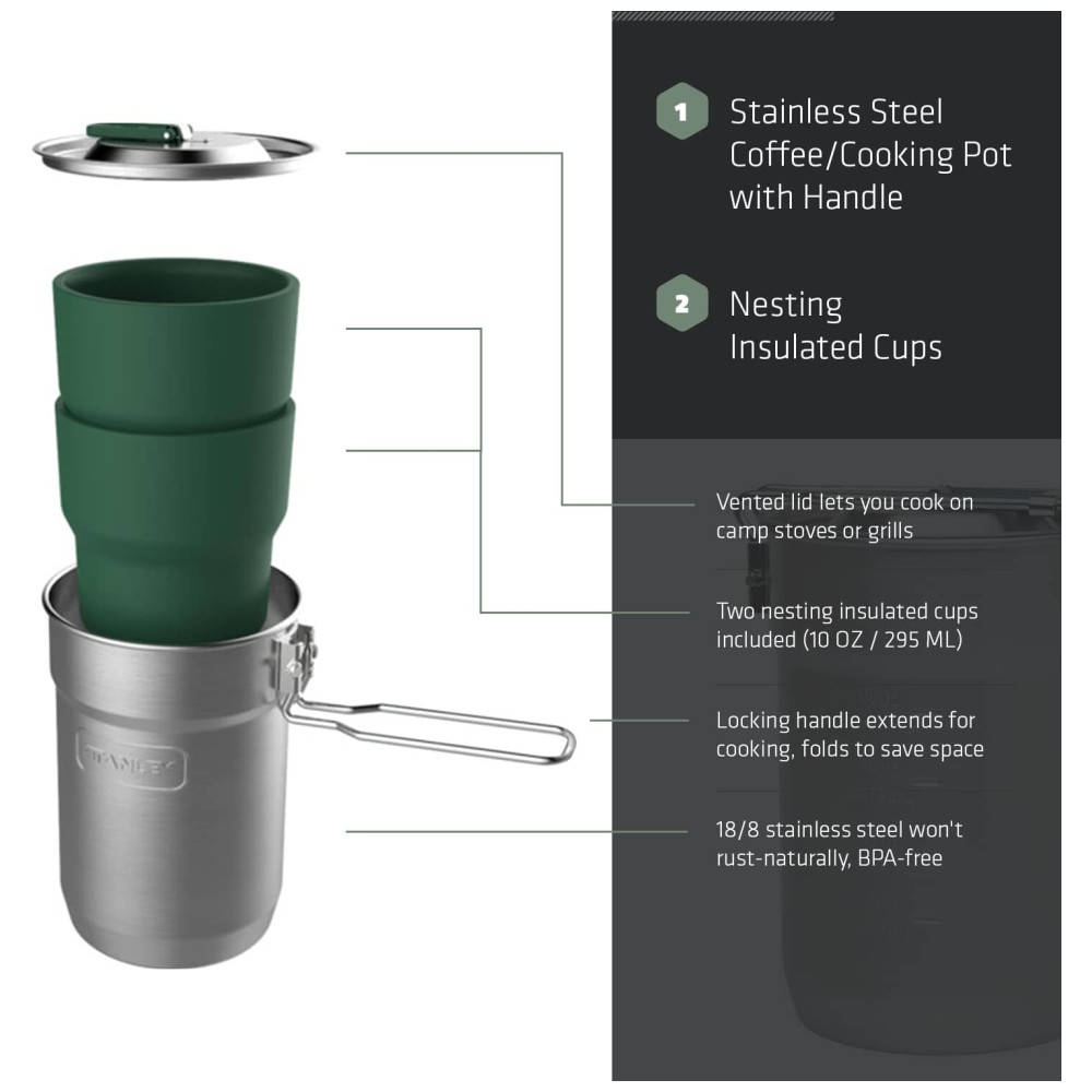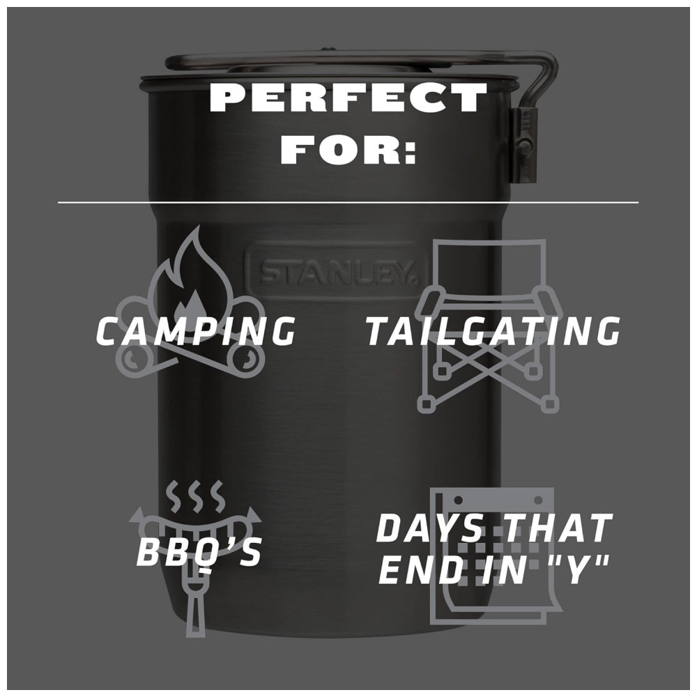 ACESSÓRIOS IDEAL PARA EXTERIORES O kit de cozinha Stanley é perfeito para cozinhar ao ar livre para refeições quentes, café ou água fervente. Nossas panelas vêm com uma parte superior ventilada para deixar o vapor escapar ou filtrar o líquido. Este é um ótimo presente de suprimentos de sobrevivência também