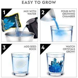 CRESCER É FÁCIL Instruções fáceis de seguir e 2 câmaras de cultivo de silicone tornam o cultivo de seus cristais mais fácil do que nunca. Nossas novas sementes de cristal transparente podem ser deixadas em seus delicados cristais, e os cristais cultivados podem ser colocados diretamente em seu display