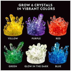 CRISTAIS DE CRESCIMENTO RÁPIDO EM 6 CORES Vermelho, verde, azul, roxo, amarelo e brilham no escuro, a química dos cristais nunca foi tão rápida cresce em 3 a 4 dias, divertida e colorida O presente educacional perfeito para meninos e meninas