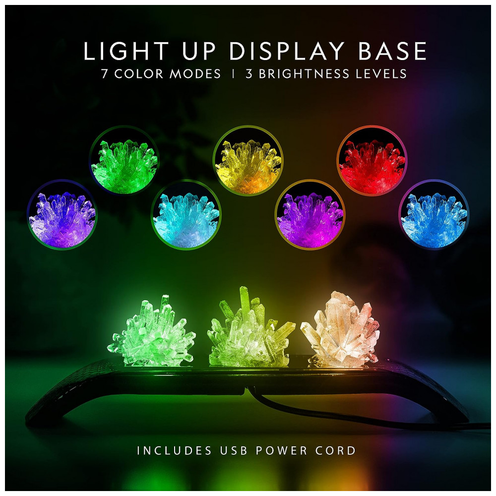O suporte iluminado patenteado exibe os cristais com sete modos de cor, modo arco-íris e três níveis de brilho, transformando-os em uma peça decorativa única ou um elegante abajur noturno. O kit inclui todos os elementos necessários para o experimento: pós cristalinos de cores diferentes, pedras sementes transparentes, um recipiente flexível para crescimento dos cristais, um bastão para mexer, lupa de observação e três cristais genuínos — um geodo quebrado, fluorita verde e calcita azul.