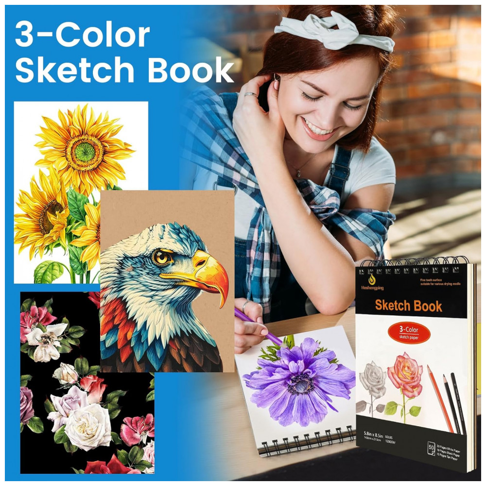 Sketchbook 3 cores: 1 unidade, 14,7 cm x 21,6 cm (5,8″ x 8,5″), 50 páginas (30 brancas, 10 sépia, 10 pretas), 120 g/m²