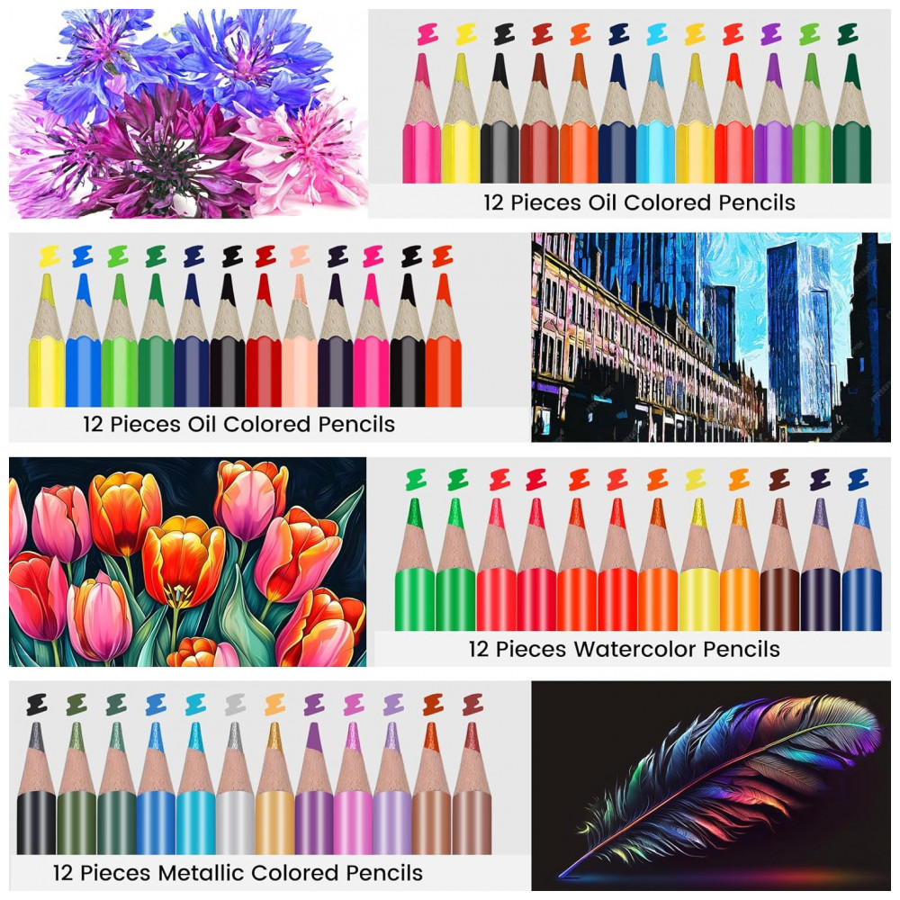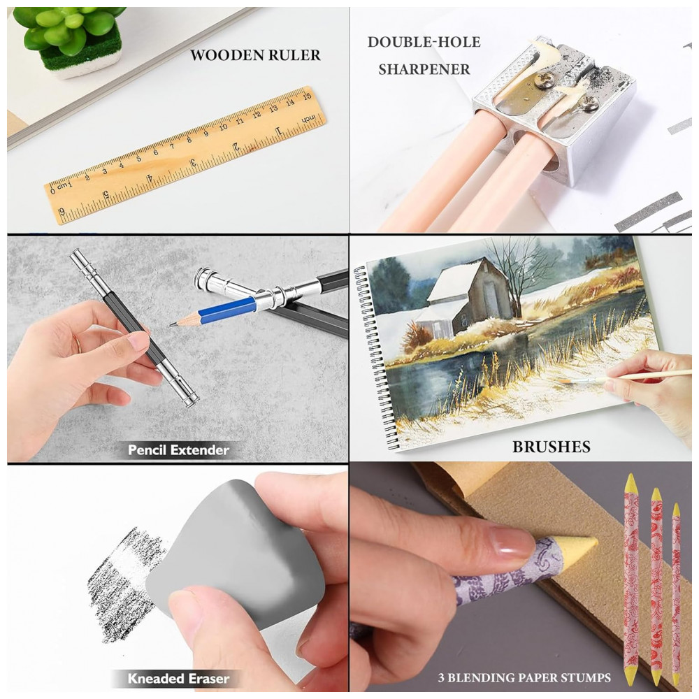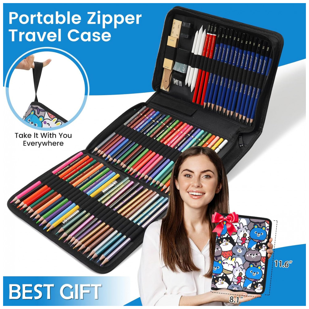 Este kit de desenho Daerthotk com 100 peças reúne lápis grafite, lápis de cor a óleo, lápis aquareláveis, lápis metálicos e carvão, além de sketchbook em três cores, livro para colorir e acessórios em um estojo portátil. O conjunto foi desenvolvido para atividades de esboço, sombreamento, mistura de cores e coloração em nível iniciante e intermediário.