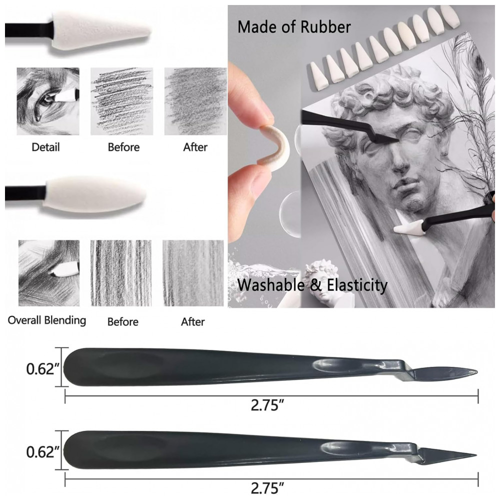 O kit inclui ainda raspadores para limpeza de traços, 20 pontas de esponja substituíveis, além de outros acessórios que apoiam mistura, correção e acabamento. O livro para colorir complementa o uso do conjunto em exercícios de coloração e prática de combinações de pigmentos.