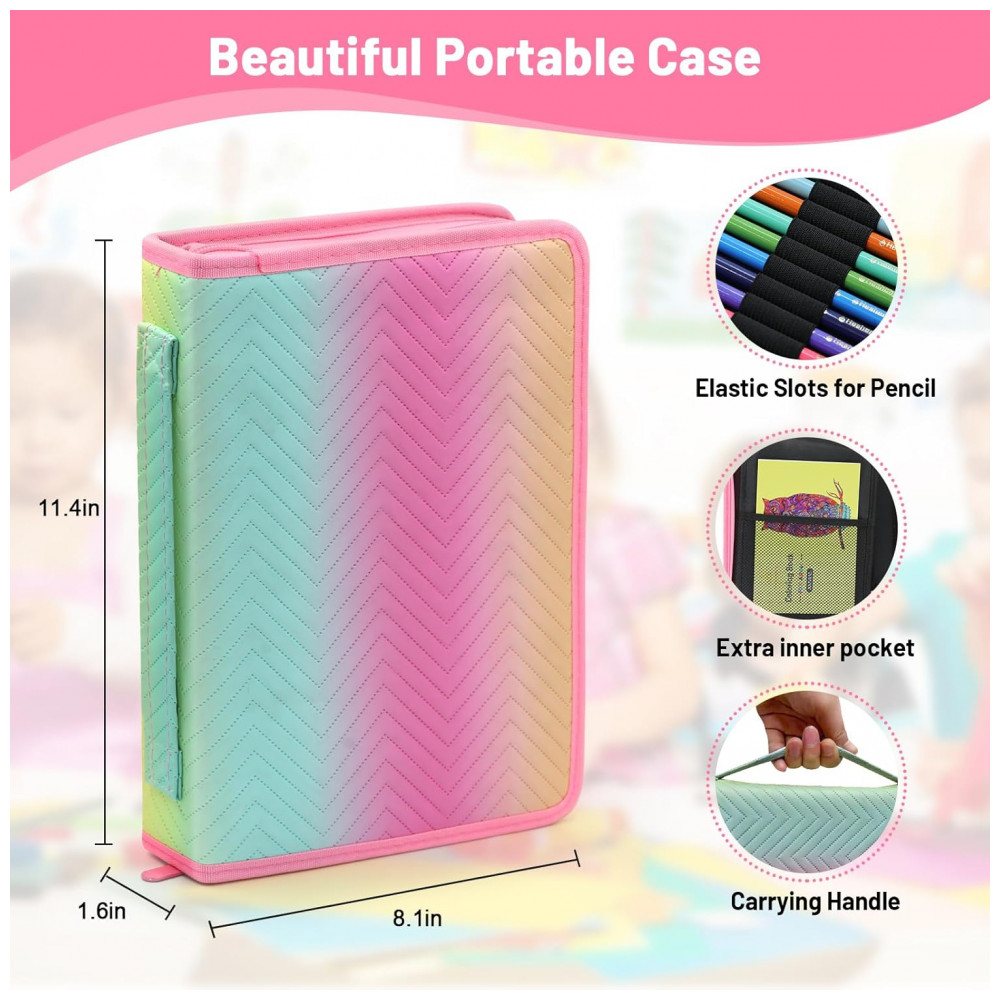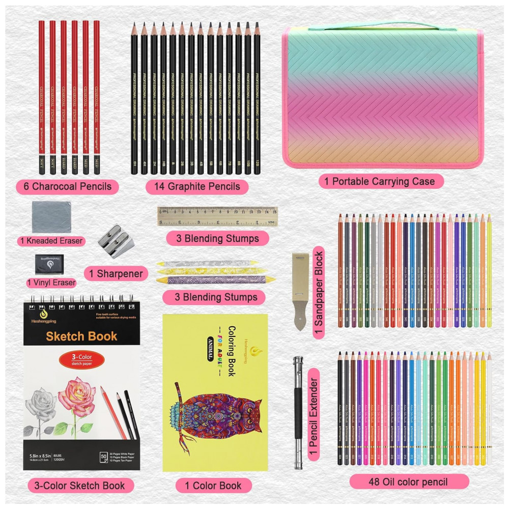 Este kit de desenho Heshengping com 80 peças reúne lápis de cor, lápis grafite, lápis de carvão e acessórios em um estojo com zíper de acabamento em degradê de cores, adequado para adultos iniciantes e praticantes de desenho. O conjunto é indicado para esboço, sombreamento, coloração e estudos em sketchbook, tanto em ambiente interno quanto em uso ao ar livre.