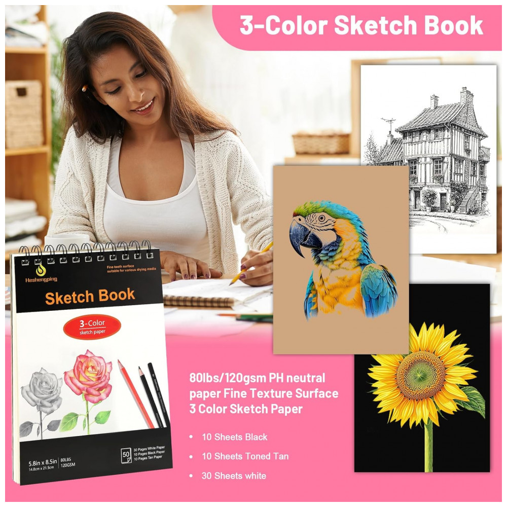O sketchbook de três cores oferece papel em tonalidades diferentes para explorar contrastes e técnicas de sombreamento. O livro para colorir amplia o uso do conjunto em exercícios de coloração e prática de combinações de cores em desenhos prontos.