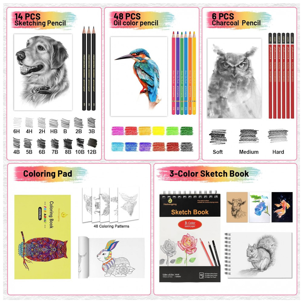 Kit de desenho 80 peças Heshengping com 48 lápis de cor lápis grafite carvão sketchbook 3 cores livro para colorir e estojo