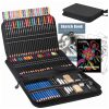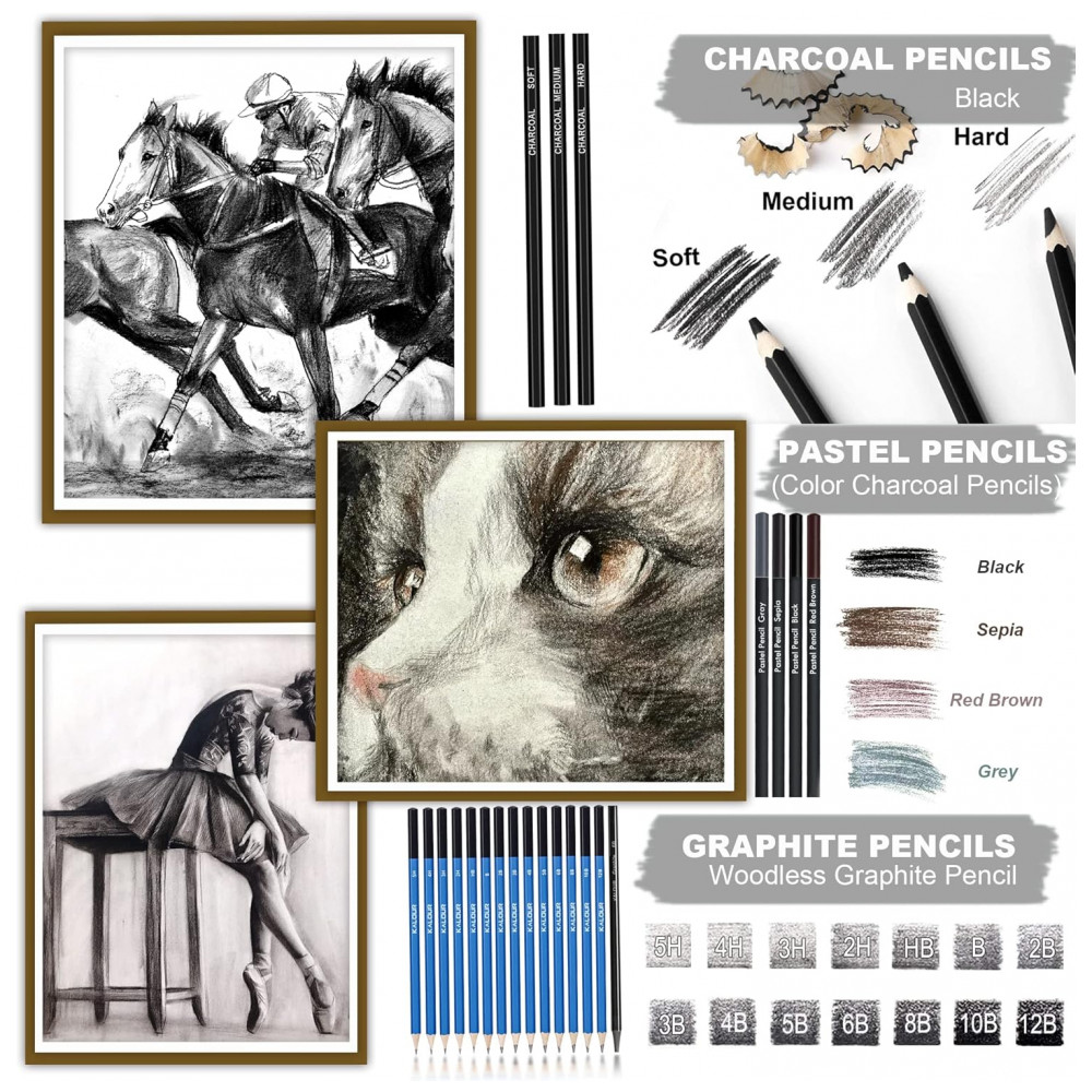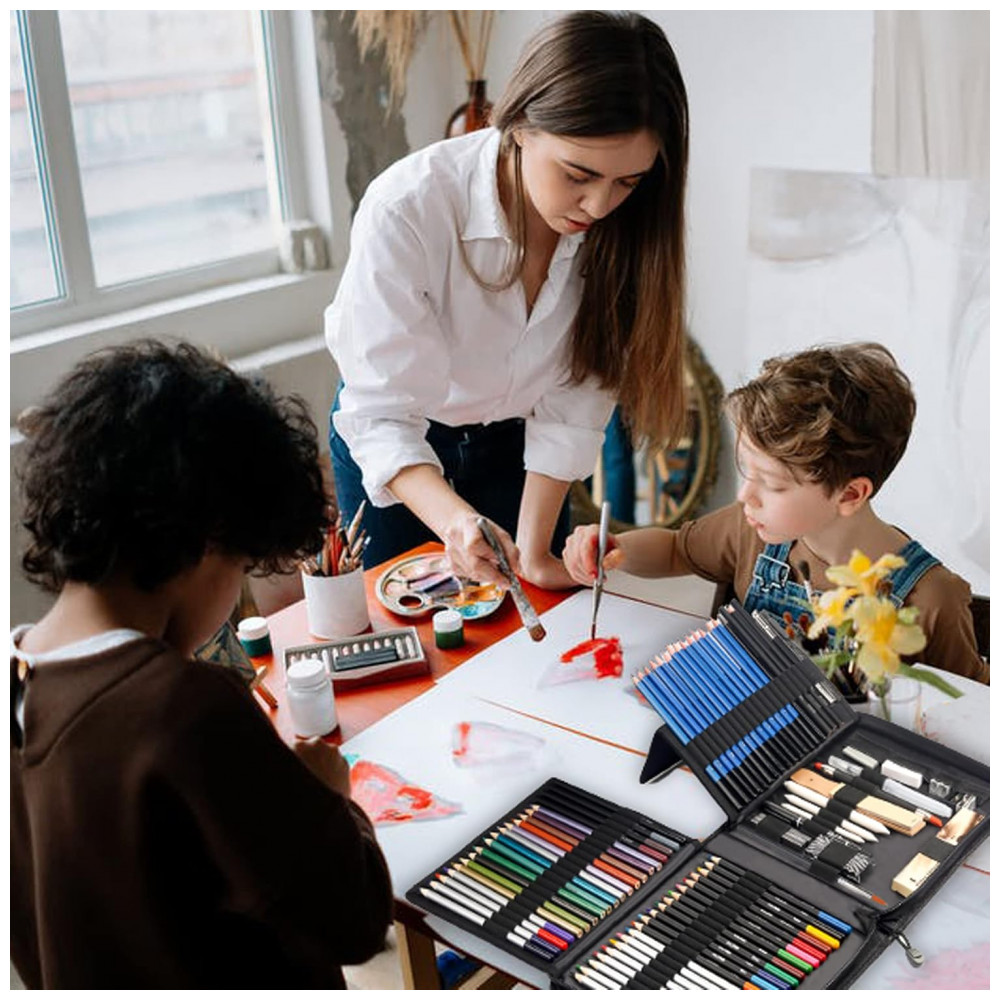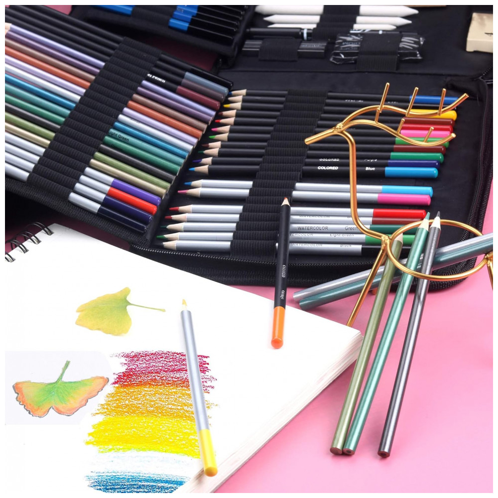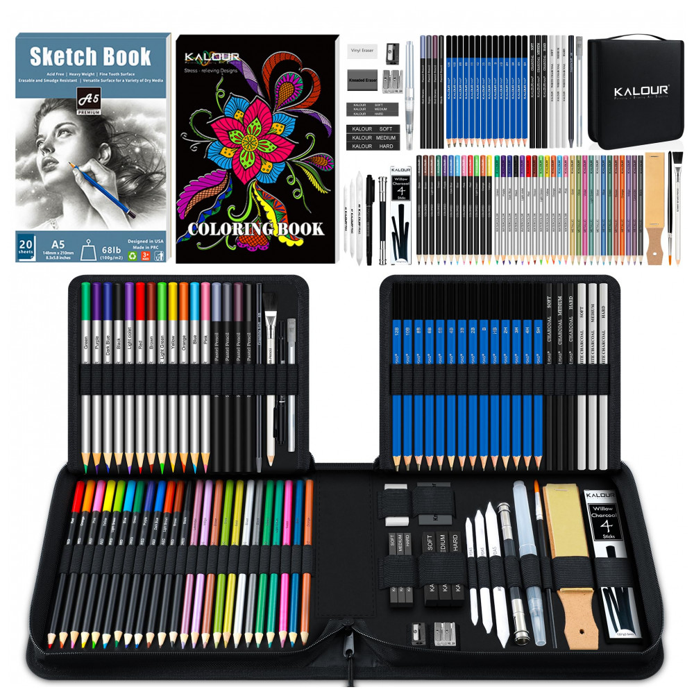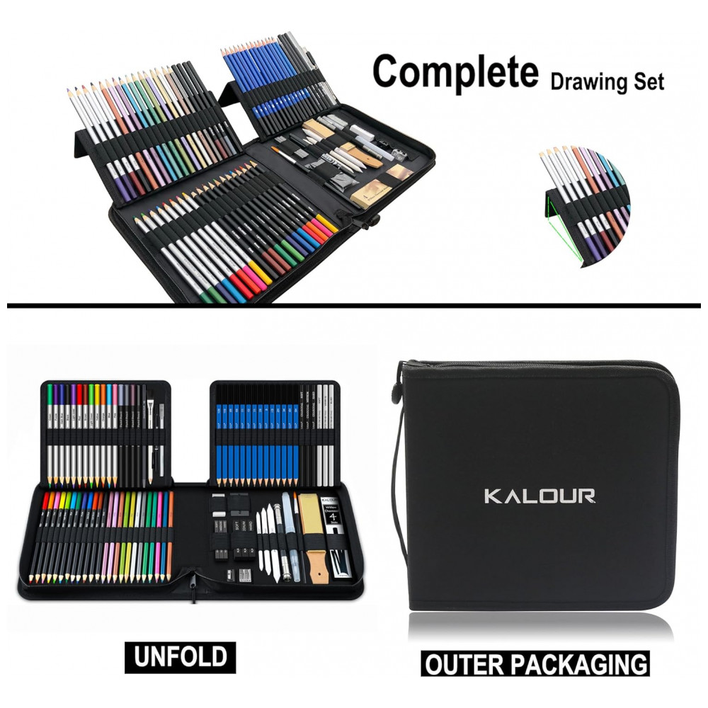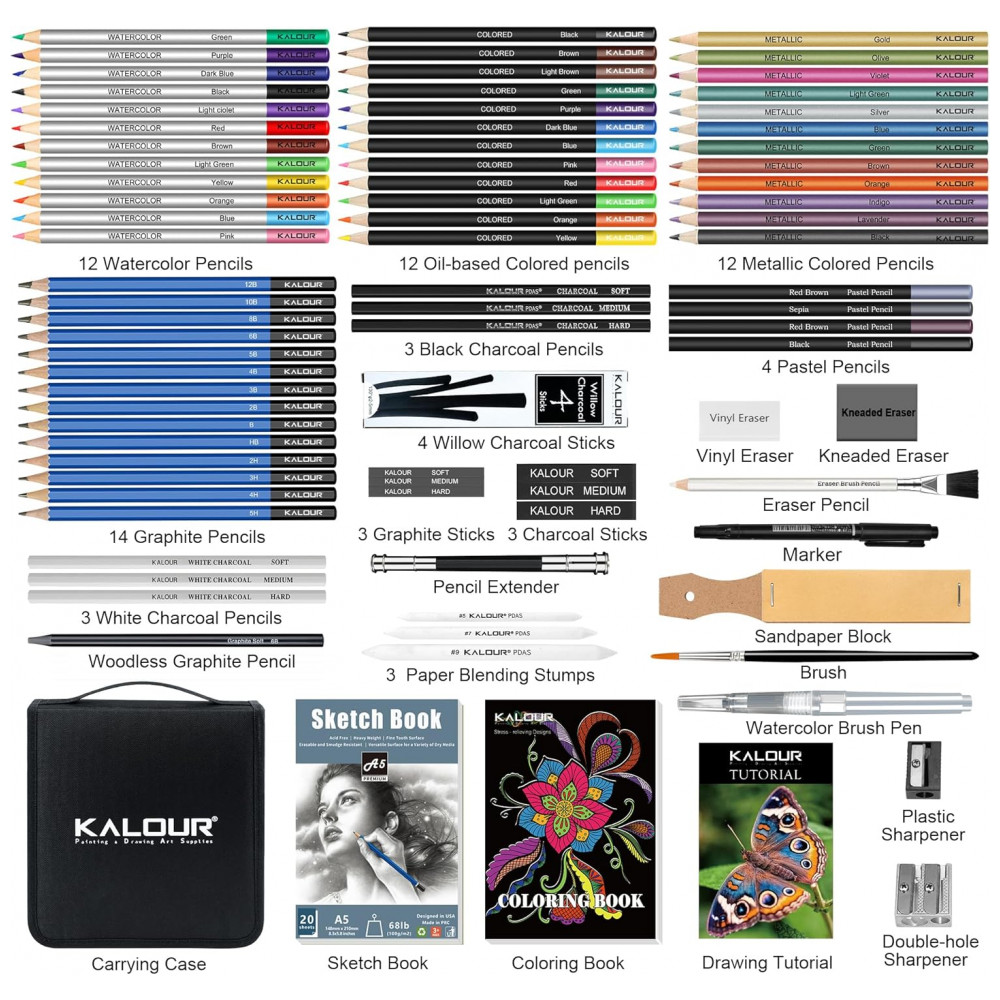 Kit de desenho 82 peças KALOUR com lápis grafite cor aquarela metálico pastel sketchbook e estojo nylon preto