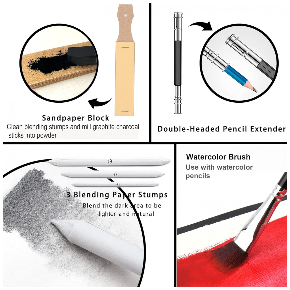 O conjunto inclui acessórios como bastões de carvão, esfuminhos, bastões de grafite, apontadores metálico e plástico, borracha vinílica, borracha maleável, extensor de lápis, bloco de lixa, pincel, caneta pincel com reservatório de água, marcador e faca artística. Esses itens auxiliam em mistura, correção, texturização e manutenção das pontas de lápis.