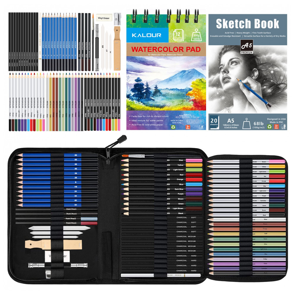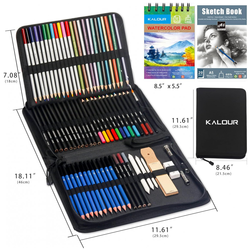 Kit de desenho e esboço 76 peças KALOUR com lápis grafite cor aquarela metálico carvão sketchbook bloco aquarela e estojo