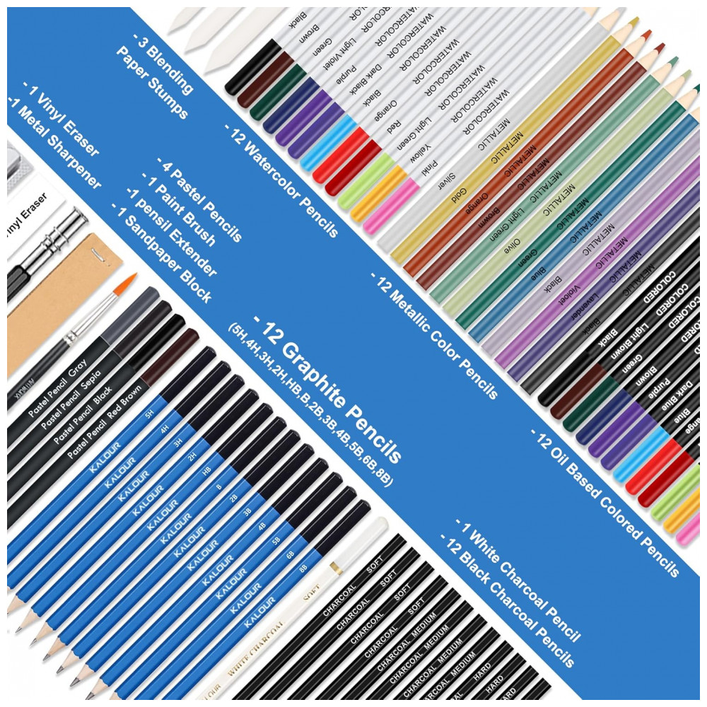 Este kit de desenho e esboço KALOUR com 76 peças reúne diferentes tipos de lápis artísticos, acessórios e blocos de papel para desenho seco e aquarela em um único conjunto portátil. A seleção foi desenvolvida para estudos de sketch, coloração, sombreamento e misturas em nível iniciante e intermediário.
