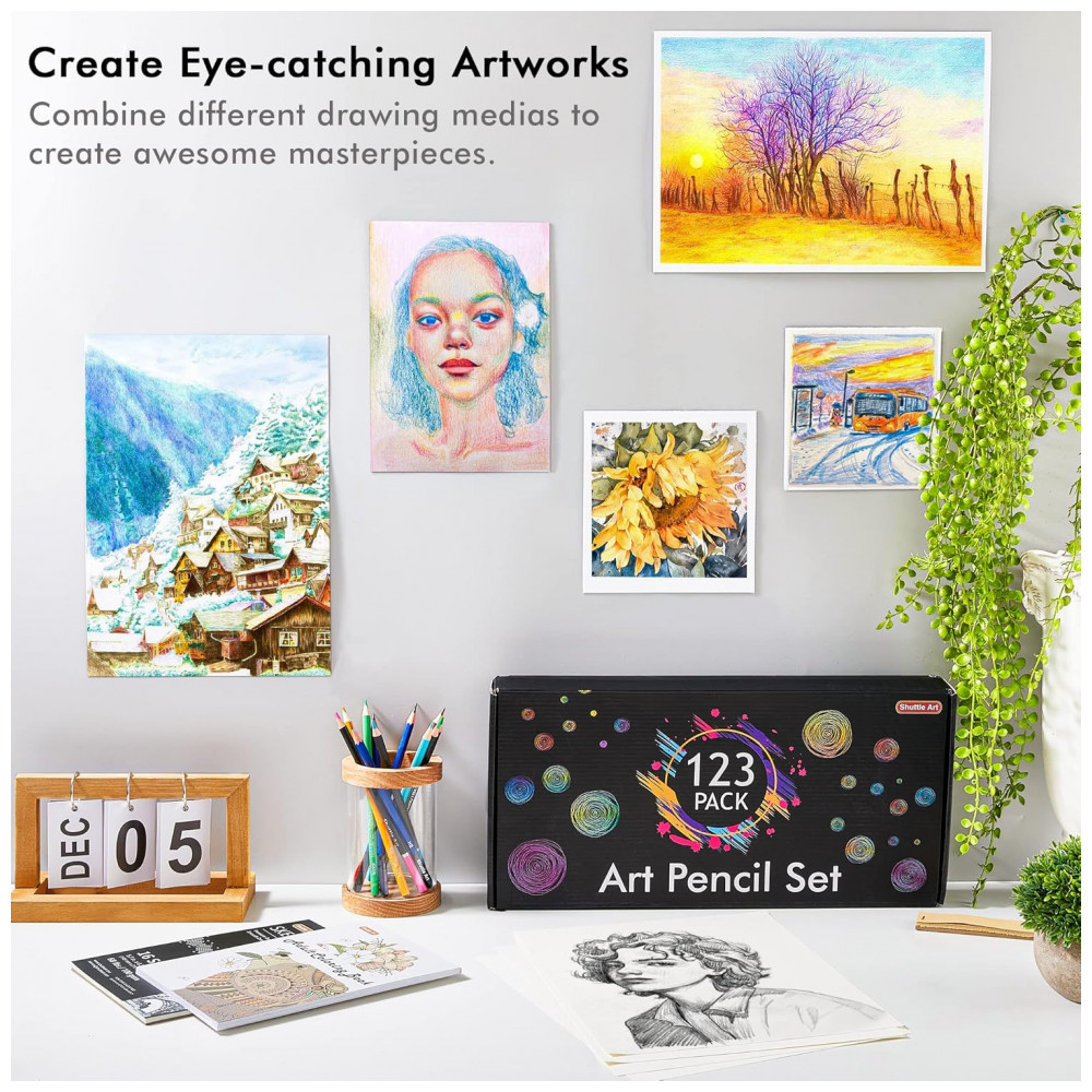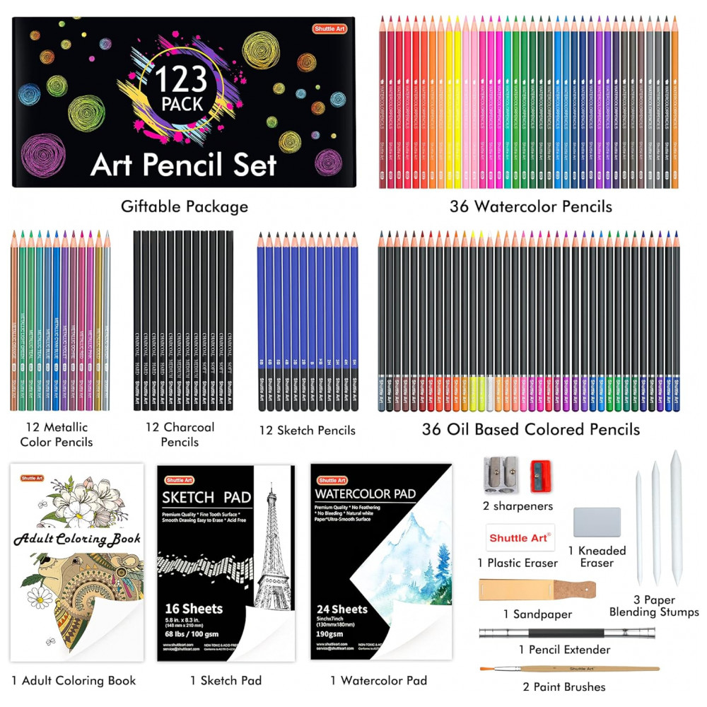 Conjunto Shuttle Art com 123 peças focado em desenho, coloração e sketch, reunindo 108 lápis artísticos e diversos acessórios em um único kit. Atende de adolescentes iniciantes a artistas adultos, indicado para estudos de desenho, colorização e técnicas mistas em papel.
