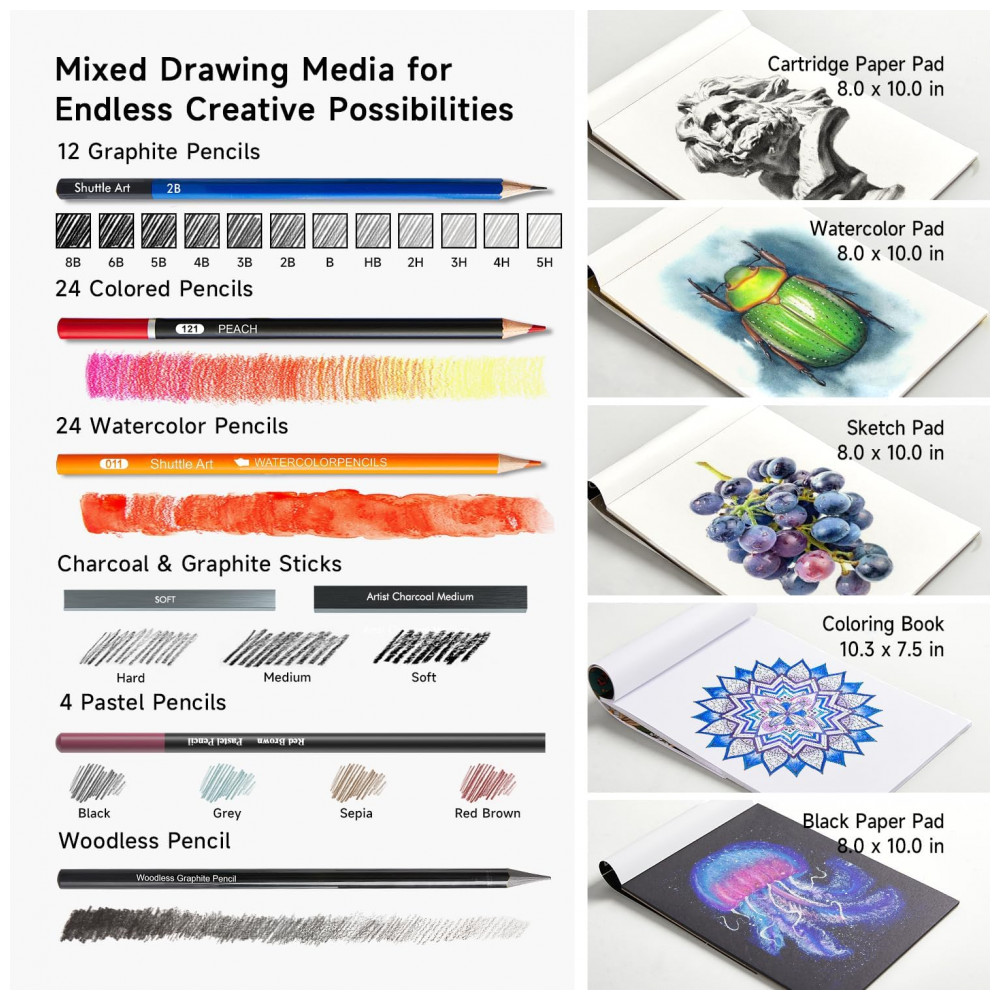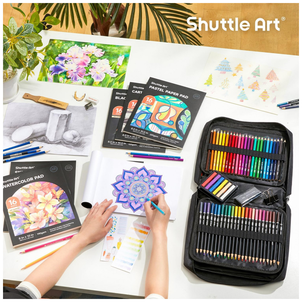 Kit de desenho Shuttle Art 124 peças com lápis de grafite carvão lápis de cor aquareláveis metálicos pastéis e blocos de papel em estojo com zíper