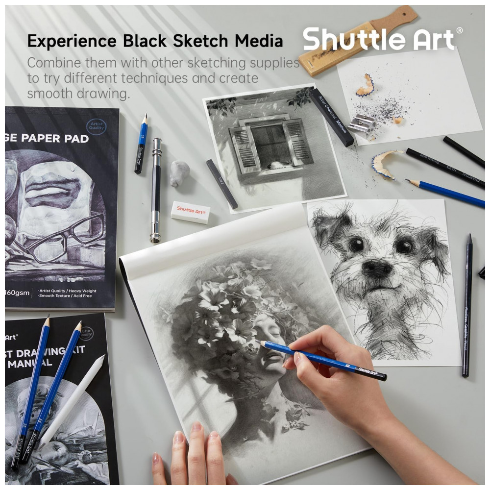 Kit de desenho Shuttle Art com 124 peças, desenvolvido para crianças, adolescentes e adultos, reunindo lápis de diferentes tipos, bastões, acessórios de desenho e blocos de papel em um estojo único com zíper. A composição permite trabalhar desenho, esboço, sombreamento, coloração, sobreposição de camadas e estudos de luz e sombra em diversas superfícies de papel.