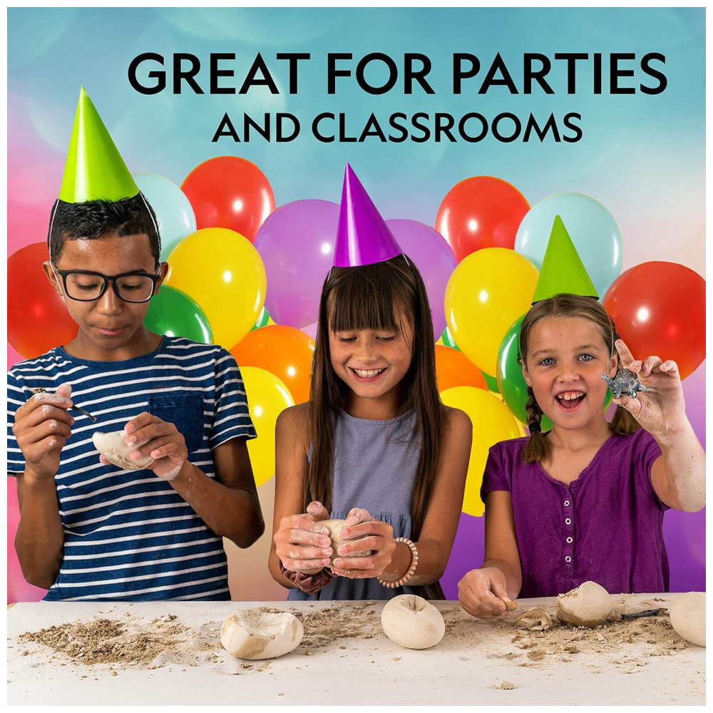 Conteúdo do kit: 12 blocos de escavação em formato de ovo, 12 figuras de dinossauro, 12 conjuntos de ferramentas de escavação, 12 pincéis e guia de aprendizado colorido