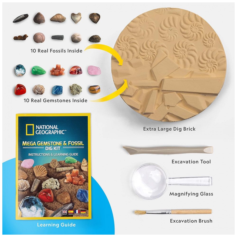 Kit de Escavação com 20 Fósseis e Pedras Preciosas Reais para Crianças National Geographic