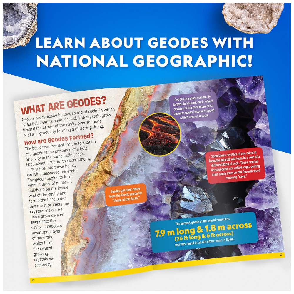 Conteúdo do kit: 2 geodos de aproximadamente 8‑10 cm de diâmetro cada, guia de aprendizagem em cores com fatos sobre geodos