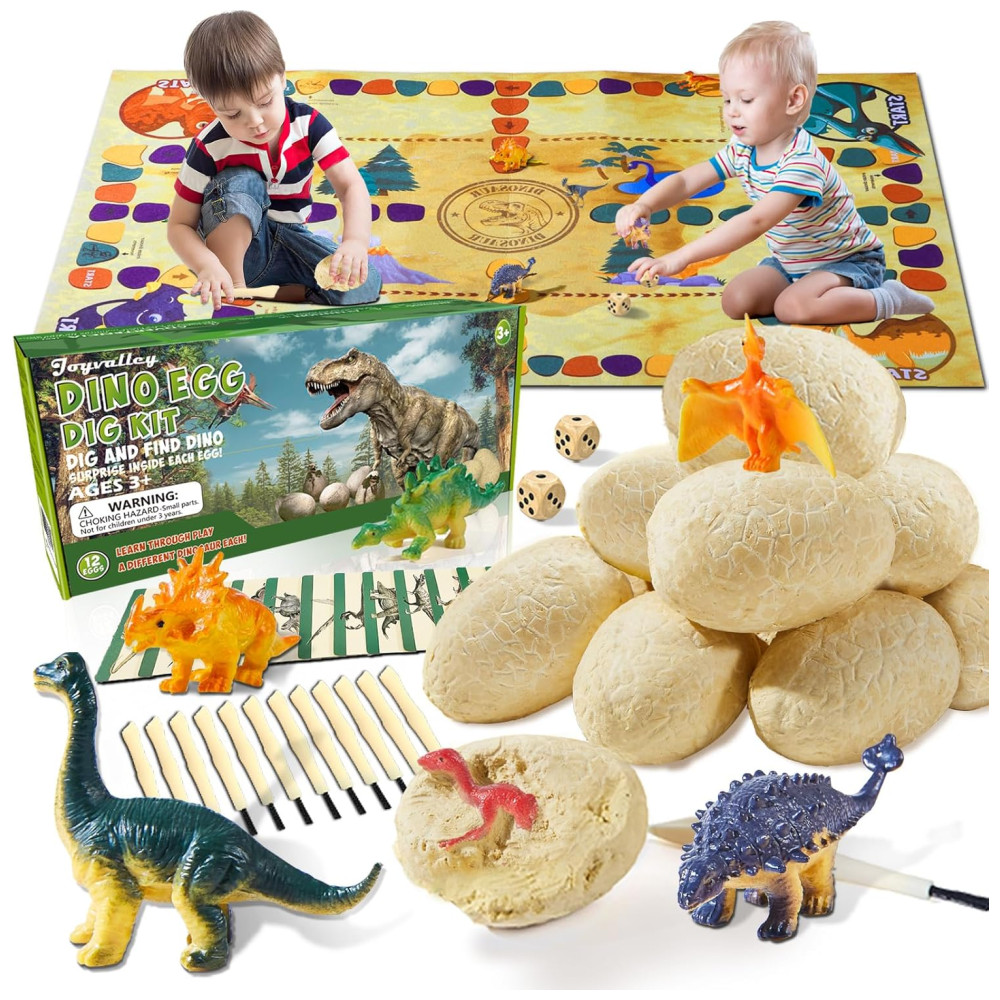 Kit de Escavação de Ovos Fósseis de Dinossauro com 12 Un e Tapete de Jogo para Crianças Acima de 3 Anos Joyvalley