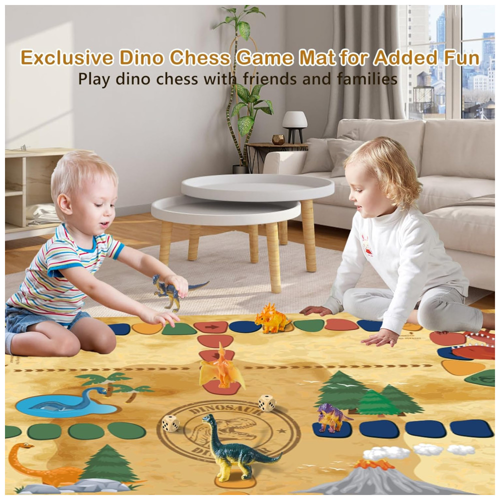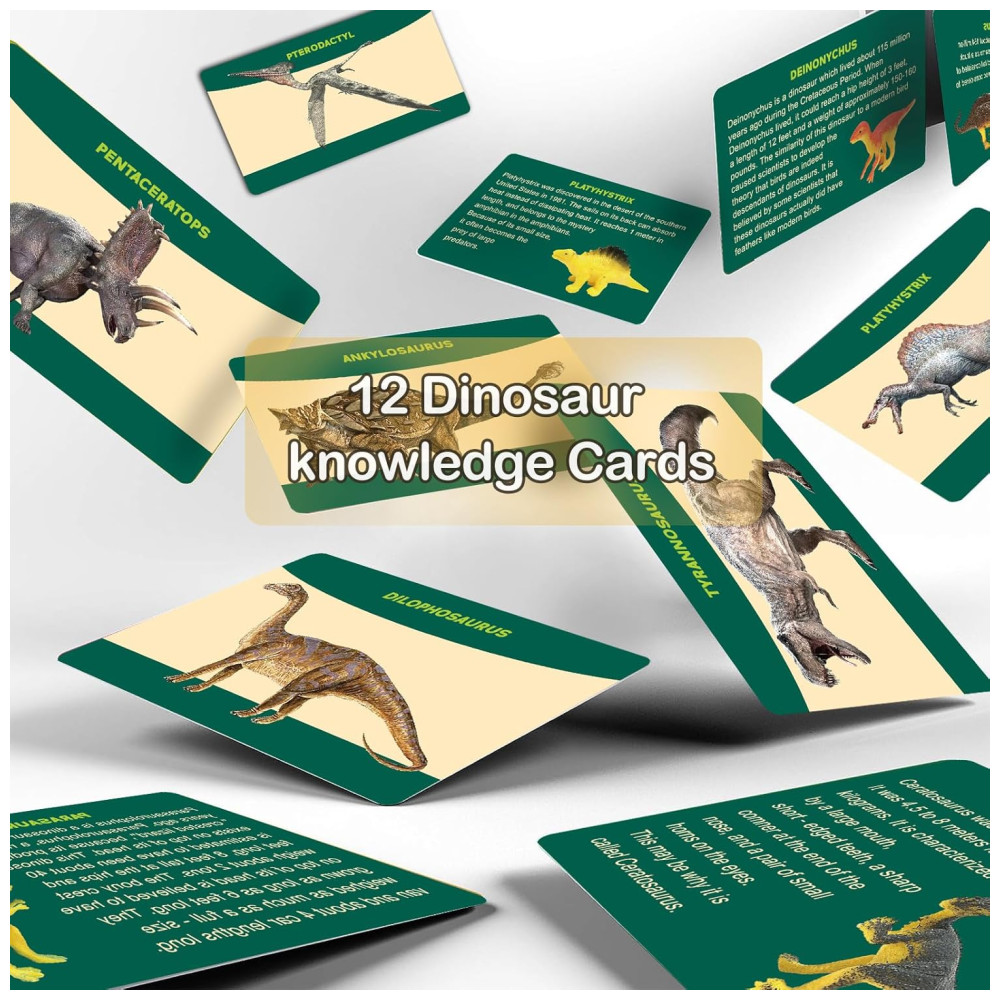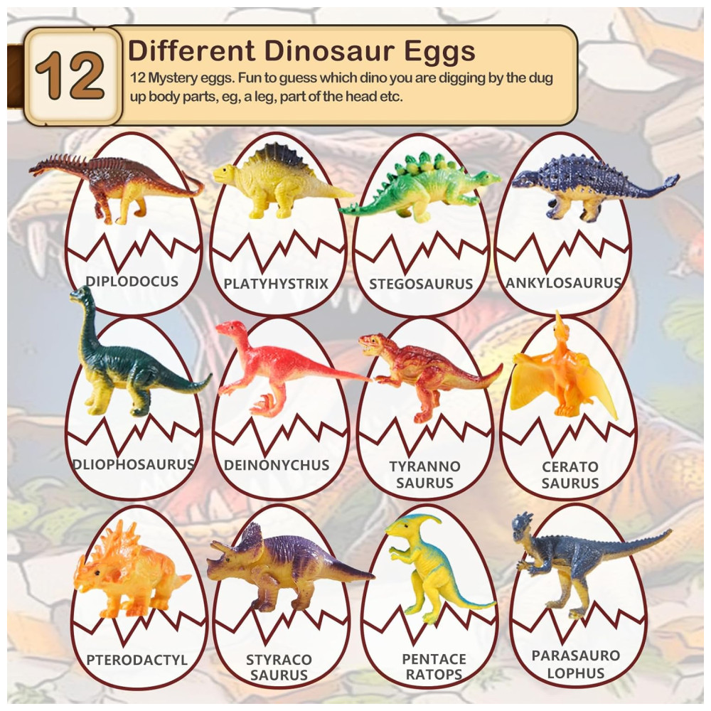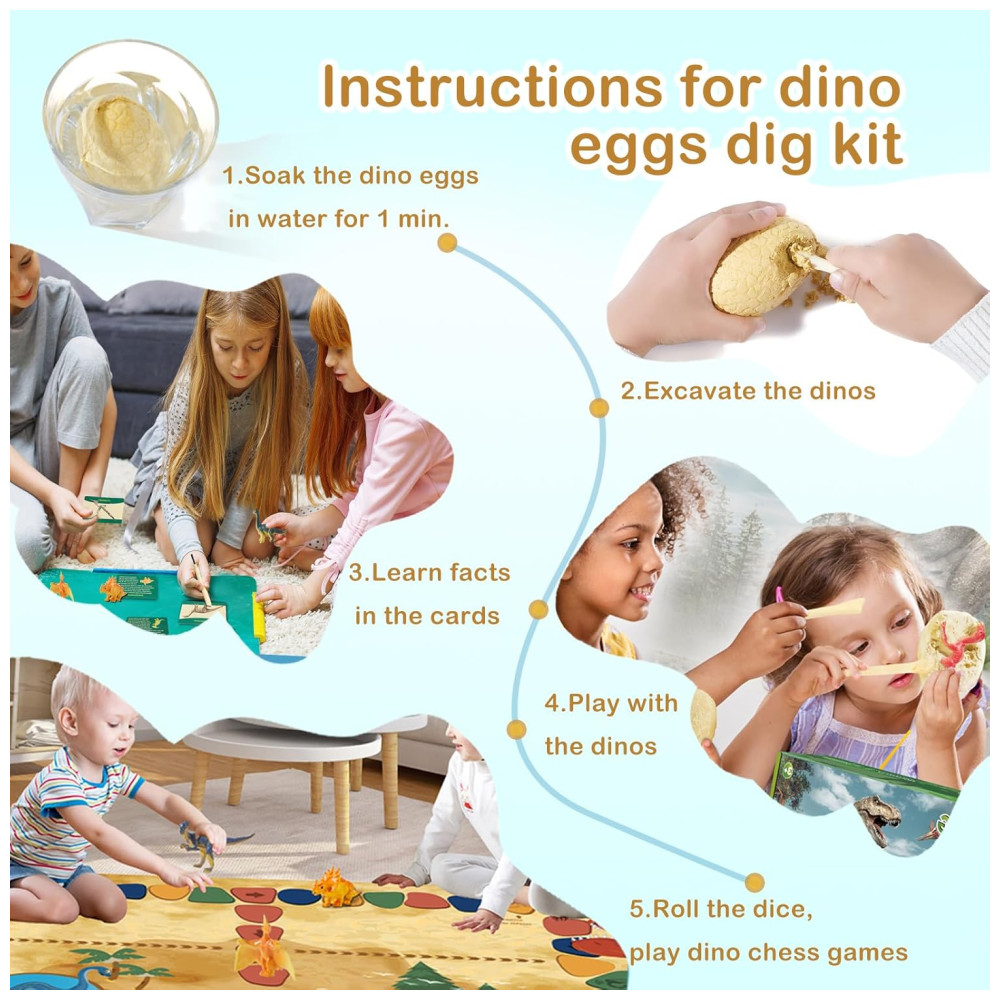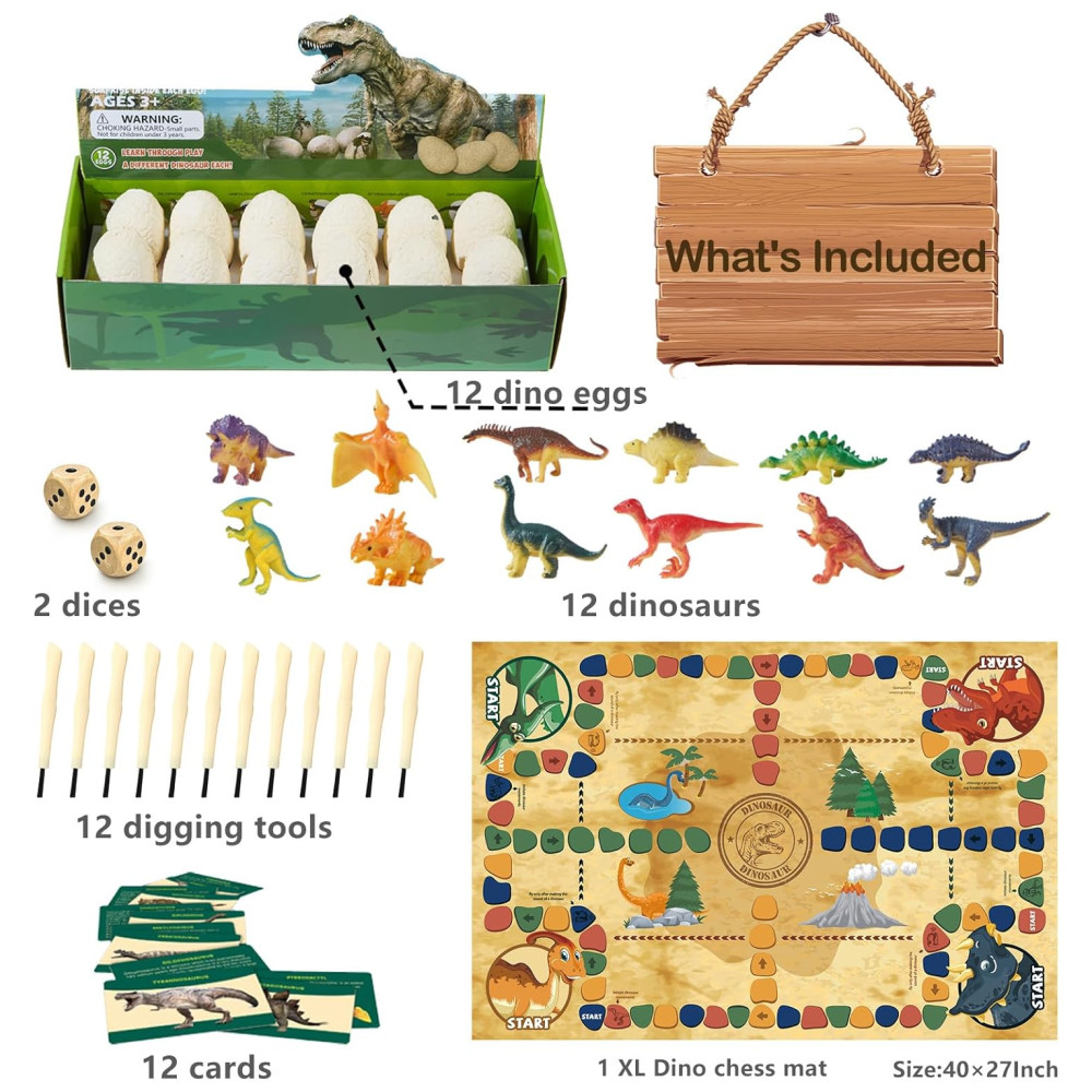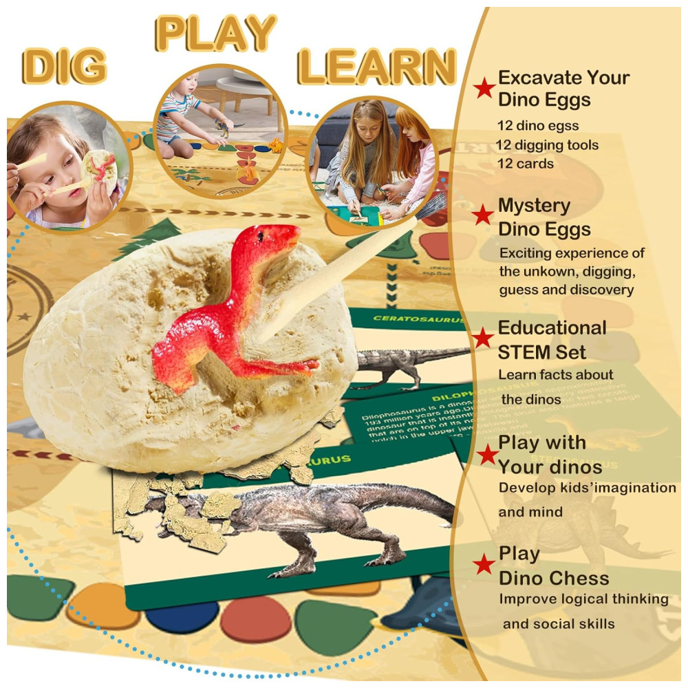O Dino Eggs Dig Kit é um conjunto divertido e educativo que permite que as crianças, bebês, adultos e amantes de dinossauros escavem 12 ovos de dinossauro para descobrir 12 dinossauros exclusivos como verdadeiros paleontólogos. O kit inclui 12 escovas de cinzel para ajudar na escavação. Além disso, o kit vem com um tapete de jogo de xadrez Dino extra grande exclusivo para uma maior diversão, 12 cartões de conhecimento sobre dinossauros para aprender fatos e histórias sobre os dinossauros, e 2 dados para jogar o xadrez Dino com amigos e familiares.