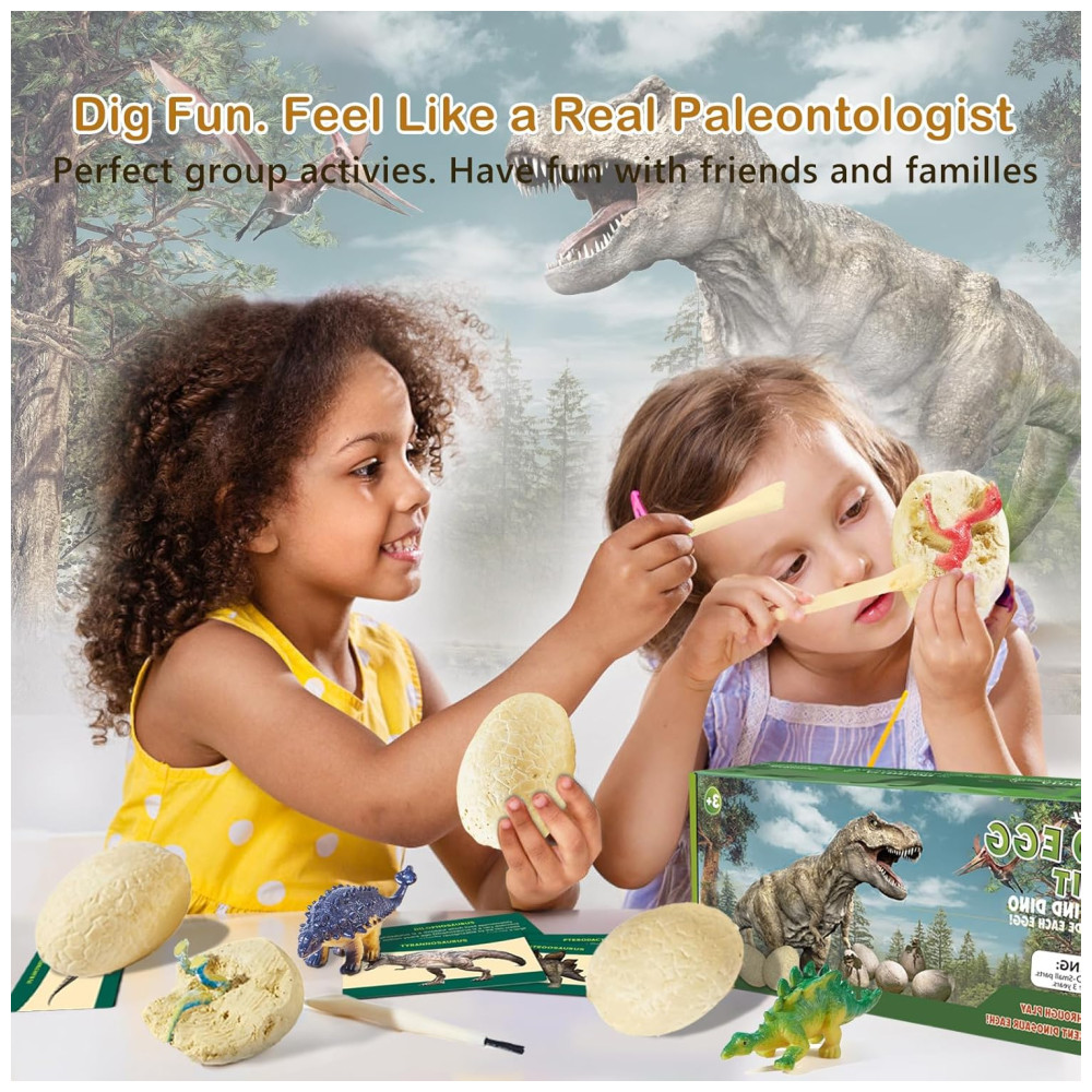 O jogo promove o amor pela ciência e pela paleontologia de uma forma divertida e emocionante. Os Mystery Dino Eggs proporcionam uma experiência emocionante do desconhecido, onde você pode adivinhar qual dinossauro está cavando pelas partes do corpo desenterradas. O kit é um presente STEM educacional divertido perfeito para todas as idades, incluindo crianças de 3 a 12 anos. Ele ajuda a desenvolver a imaginação e a mente das crianças, melhora a coordenação olho mão, pensamento lógico, habilidades motoras finas e sociais.