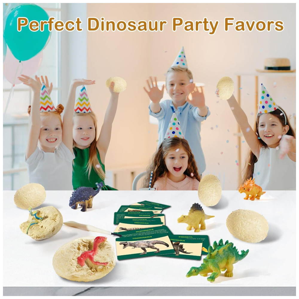 O kit é uma atividade de grupo perfeita e também pode ser usado como lembrancinhas de festa para festas de aniversário, reuniões familiares e festas de amigos. O que você ganha no kit de escavação de dinossauros são 12 ovos fósseis de dinossauros, 12 escovas de cinzel, 12 cartas de conhecimento de dinossauros, 2 dados e 1 tapete de xadrez de dinossauro XL.