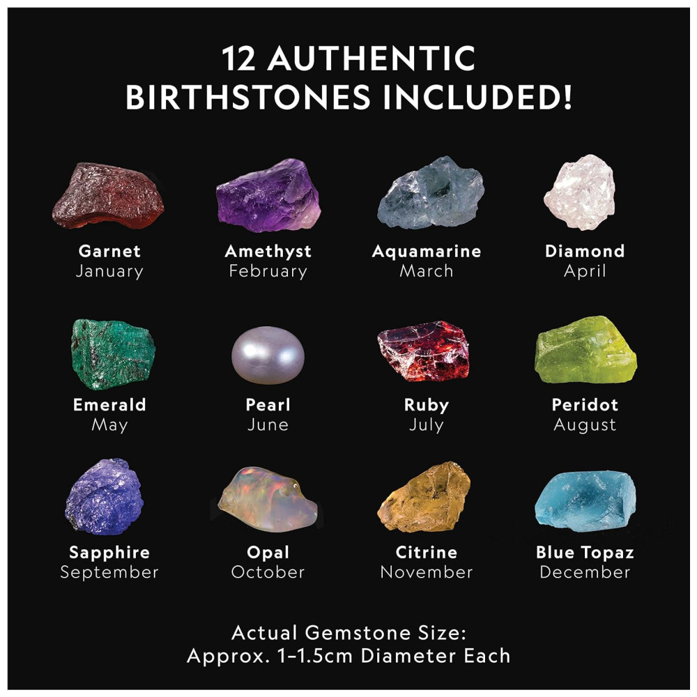 Espécimes de birthstone autênticos. Este kit de escavação é verdadeiramente especial Dentro do tijolo de escavação lindamente projetado estão 12 pedras preciosas e semipreciosas. Seus filhos vão adorar cavar e descobrir esses espécimes deslumbrantes