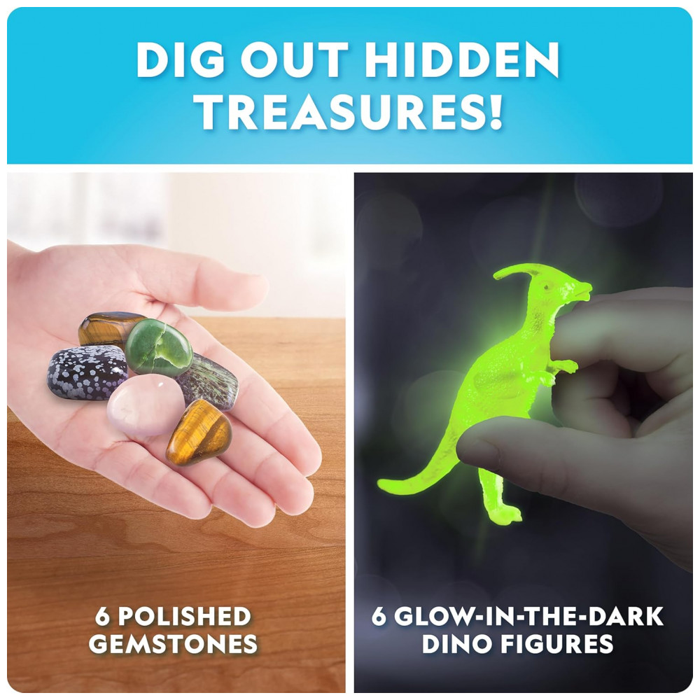 Destaques: Escavação prática estilo explorador, figuras de dinossauros que brilham no escuro, gemas reais para brincar e aprender, presente STEM ideal para Páscoa ou projeto em sala de aula