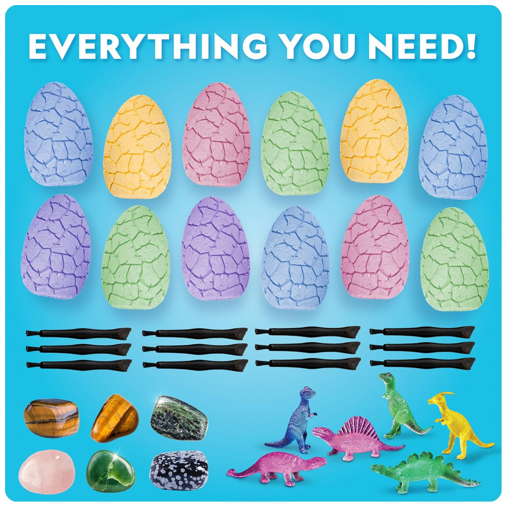 Conteúdo do kit: 12 blocos‑ovo de escavação, 12 ferramentas de escavação, 6 figuras de dinossauros que brilham no escuro, 6 gemas verdadeiras, guia educativo em cores