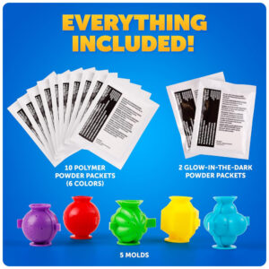 Conteúdo do kit: Até 45 bolinhas, 5 moldes moldáveis, 6 cores de pó de polímero, pó brilhante no escuro, guia de aprendizagem em cores
