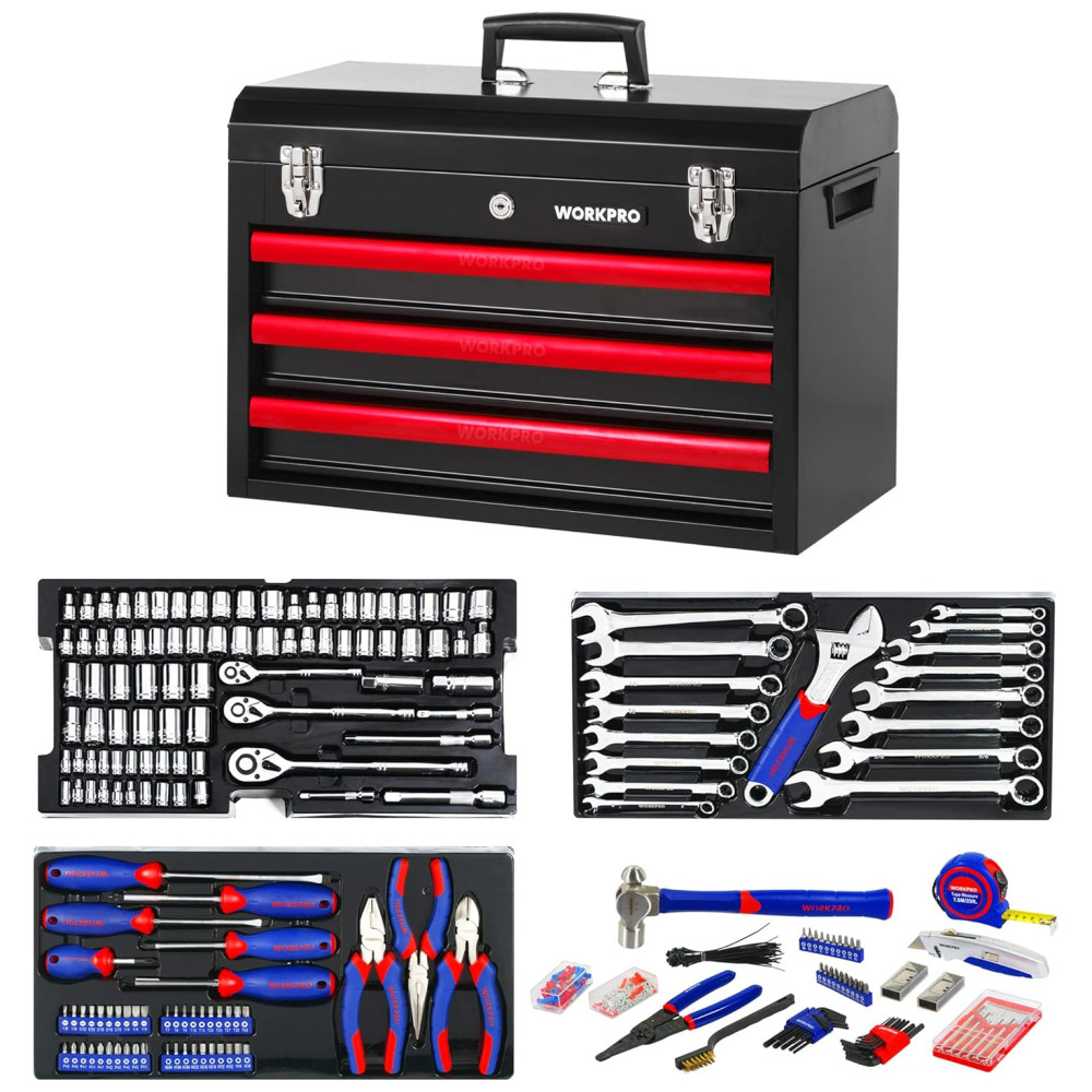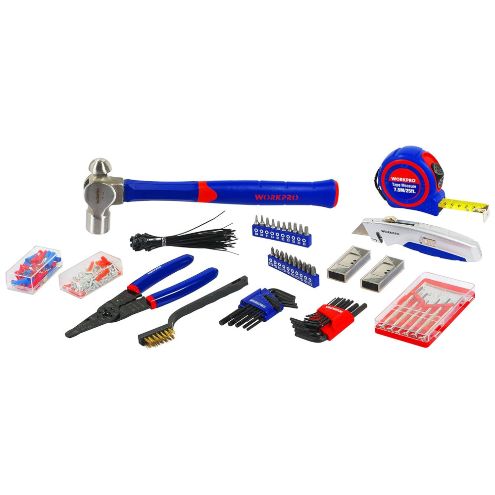 408 peças de ferramentas Inclui a maioria das ferramentas de uso diário, inclui alicates, chaves de fenda, chaves allen, chaves, soquetes, bits, fita métrica, faca, martelo, descascador de fios, etc.