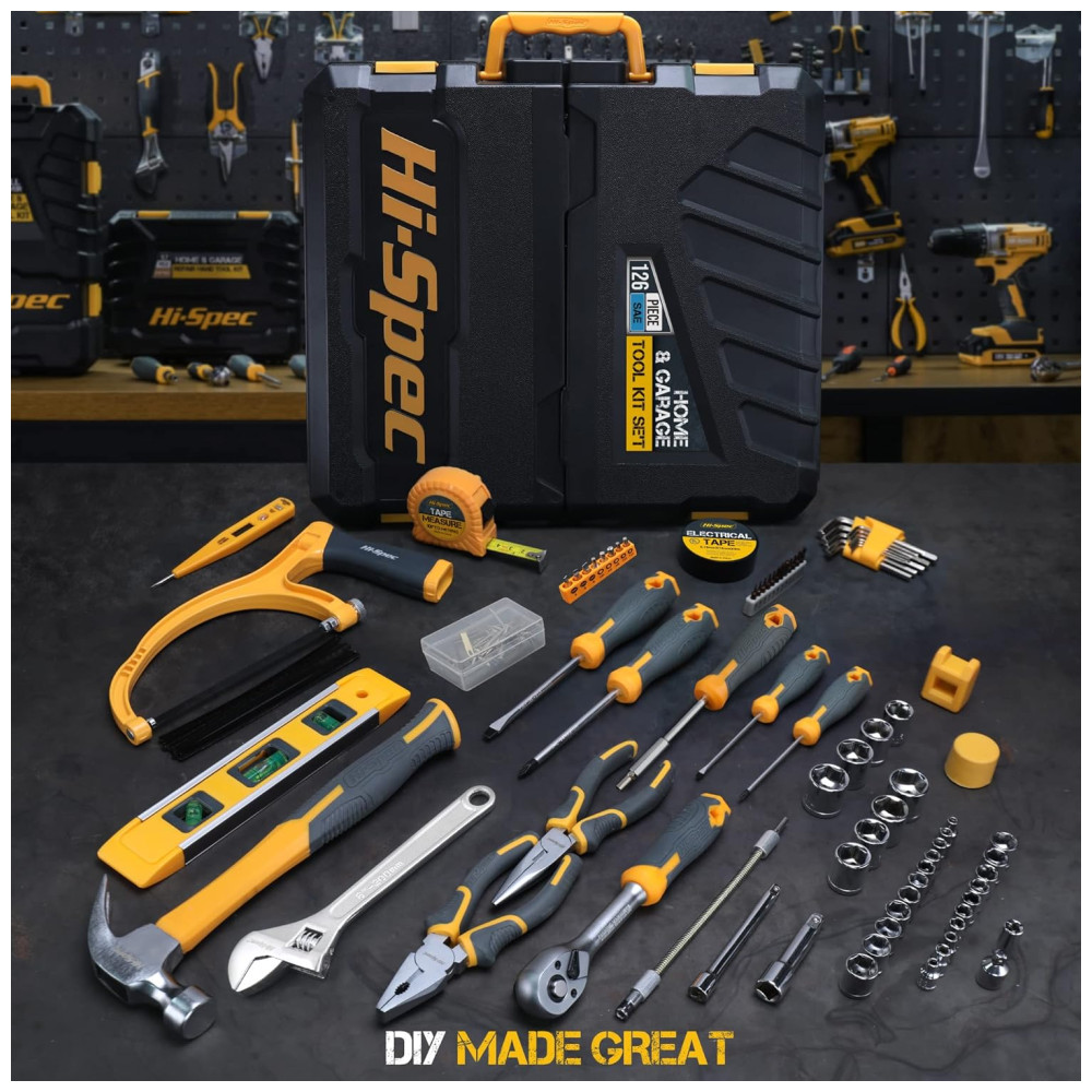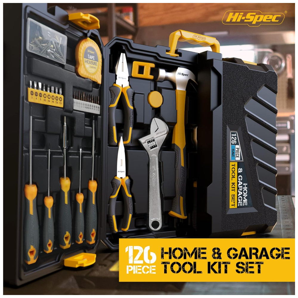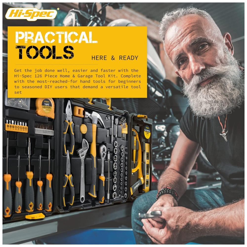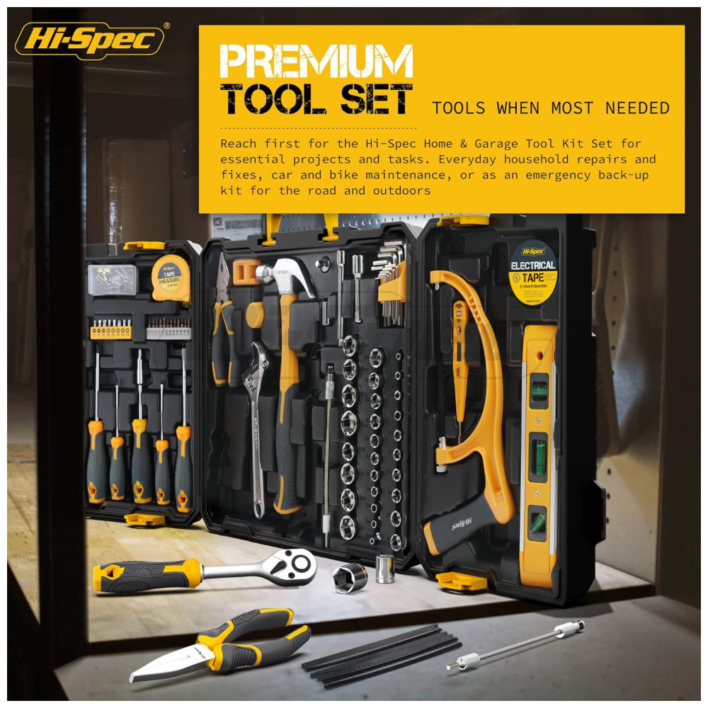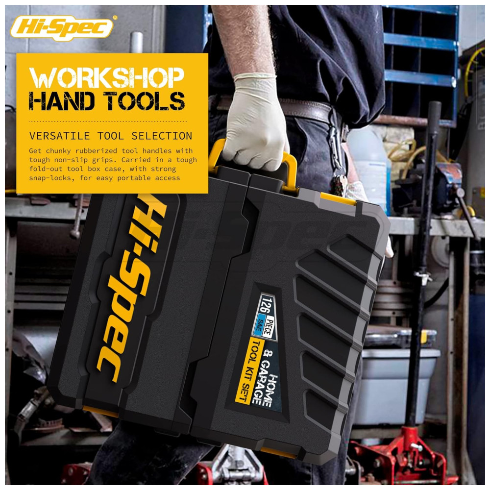 AQUI E PRONTO Conclua os trabalhos com mais facilidade e rapidez com o conjunto de kits de ferramentas para casa e garagem de 57 peças Hi Spec. Embalado com as ferramentas manuais mais alcançadas para iniciantes a usuários experientes que precisam de correções agora. Tudo em uma caixa de ferramentas dobrável e grossa com travas de pressão fortes