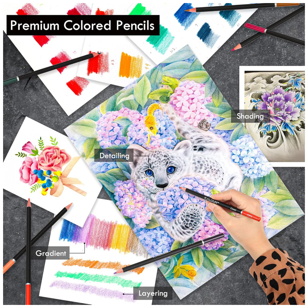 Este kit de lápis de desenho KALOUR com 144 peças combina 120 lápis de cor profissionais e um conjunto de 24 peças para esboço, organizado em estojo de viagem com zíper para uso em casa, estúdio ou deslocamentos. Os lápis de cor possuem numeração individual e minas macias, desenvolvidas para deposição uniforme de pigmento, mistura suave e sombreamento progressivo.